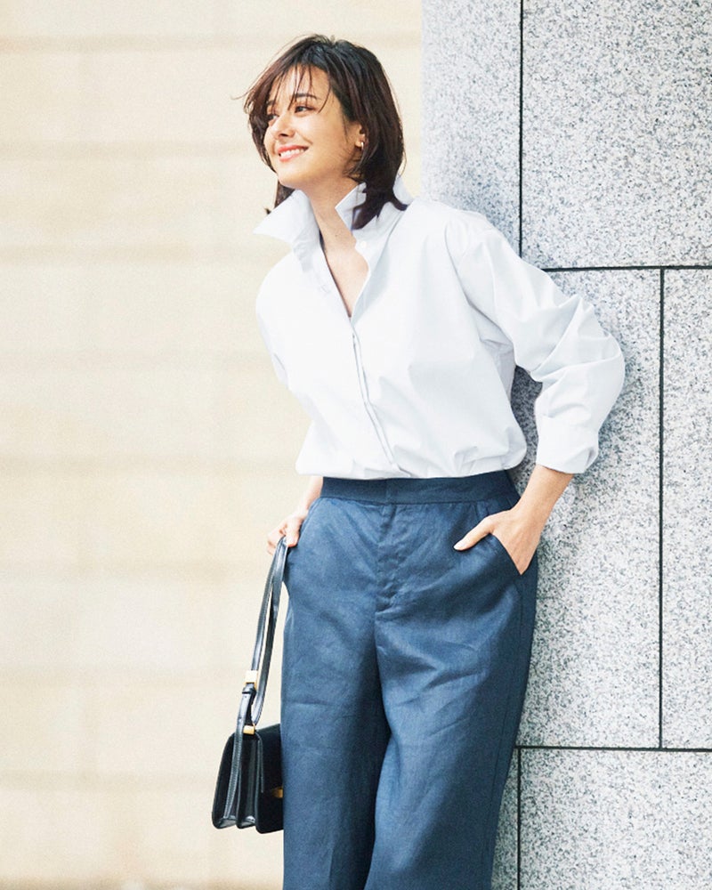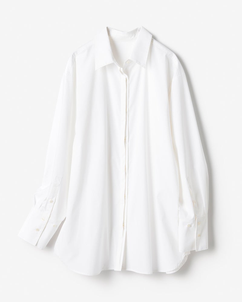 素材は、はりのある素材で衿を立てたり、衿元や裾のボタンを外してみたりといろいろなタイプの着こなしができるシャツで、出番が多そうです。
