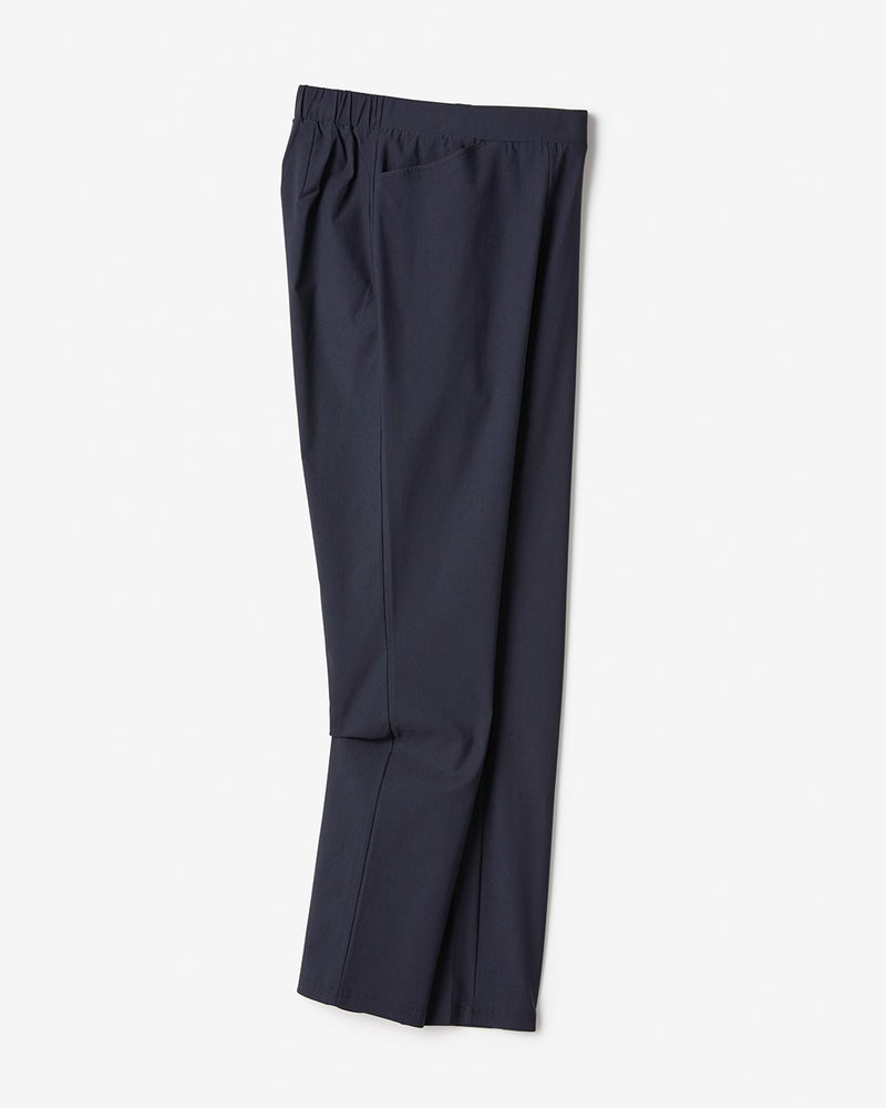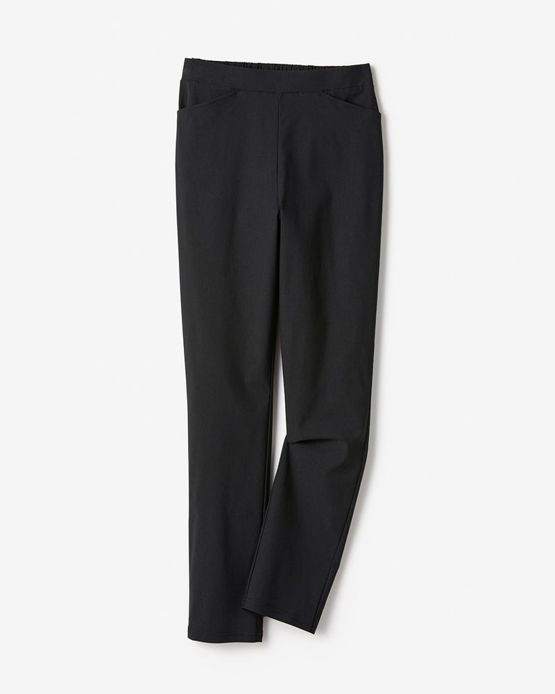 ほど良いゆとりをもたせたスリムシルエットが、骨格やボリューム感をさりげなくカバー。ウエスト総ゴムのプルオンタイプで、着脱も楽々。フロントはギャザーの寄らない平ゴムで、トップスをタックインした時もすっきりキマります。小柄な方やアンクル丈がお好きな方には、股下63cm(商品番号30539)もご用意しています。
