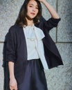 ホントに薄くて軽いスケスケの麻素材で、ノーカラーなのに前が重ね風になっているのが丁度いい塩梅のラフとキレイめの間を取ってくれてます。