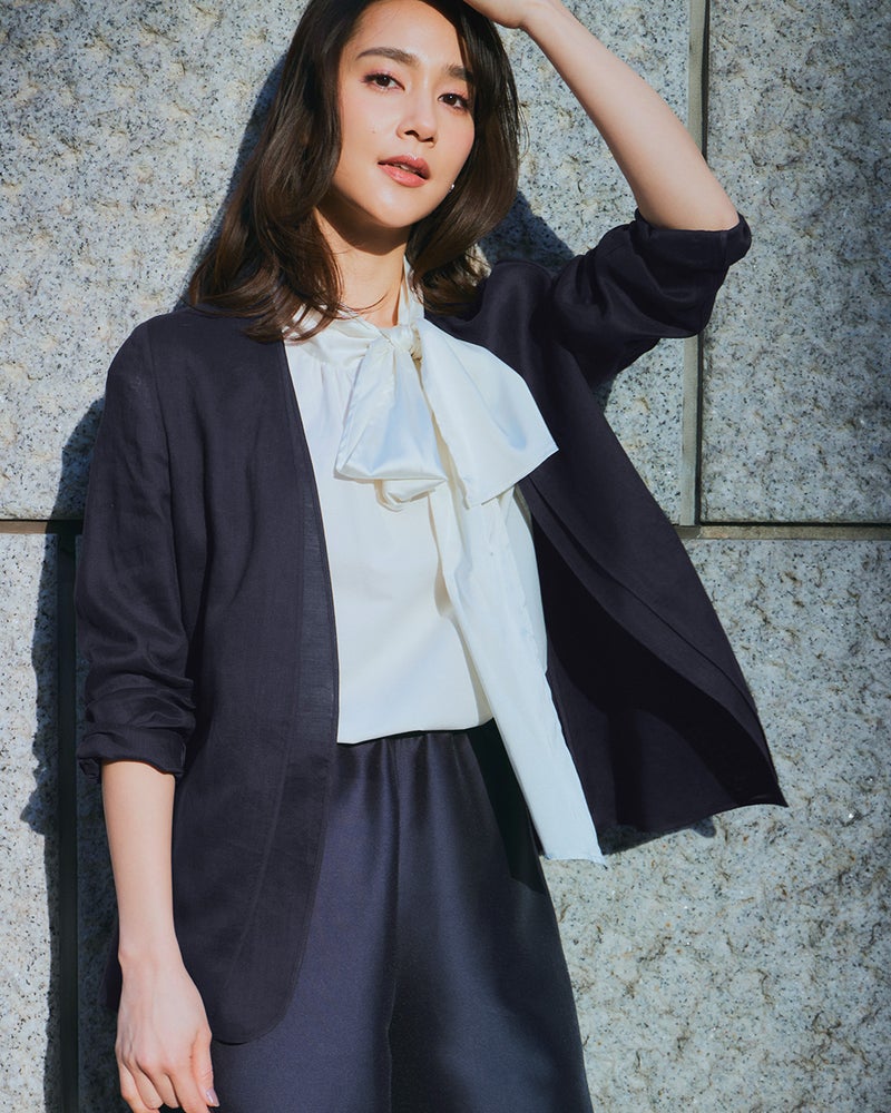 ダブルノーカラーデザインフロントが二重仕立てになったV開きノーカラーは、顔まわりがすっきり見えるデザイン。生地を重ねることで生まれる陰影がドラマティックで、テーラードジャケットよりも柔らかな雰囲気で着こなせる1着です。ボタンレスでサッと羽織れるのも魅力。