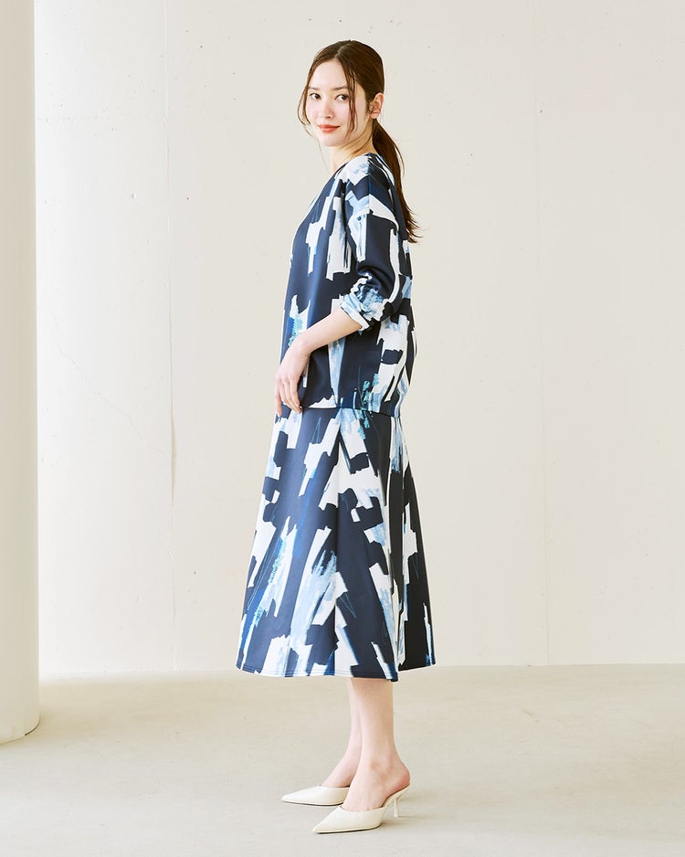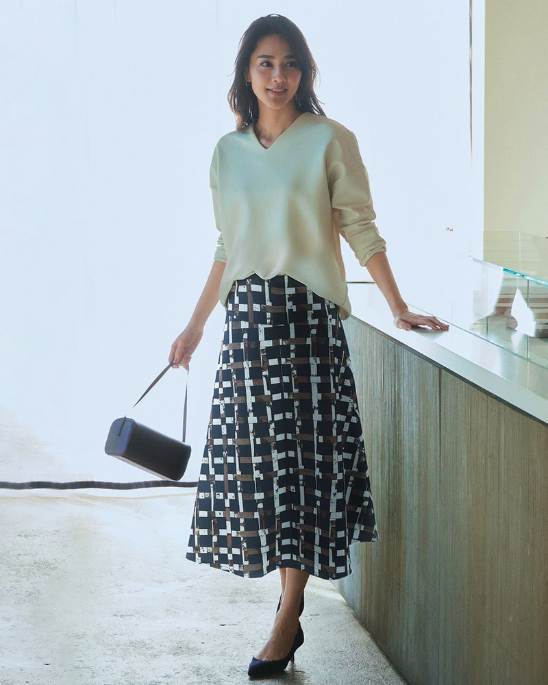 大人の女性にちょうどいい、広がりすぎないフレアシルエットや、膝がきちんと隠れる安心感のある丈にこだわりました。ストレッチ性に優れた素材ながら、ふっくら厚みがあるのでボディラインが響かず、美しく着こなせます。同素材のプルオーバー(商品番号30621)とセットアップで着こなせばオケージョンにも大活躍。