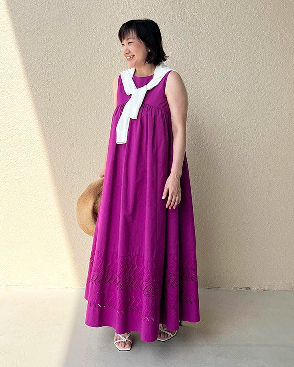 軽くてハリのあるコットン混素材を使用した、テントラインのワンピース。胸もとの曲線的な切り替えと、たっぷりギャザーを寄せることで生まれる縦のドレープが、贅沢な量感のあるシルエットもすっきり見えするデザインに仕上げています。裾の部分にはアイレット刺しゅうで、涼しげな抜け感と華やかさを添えました。