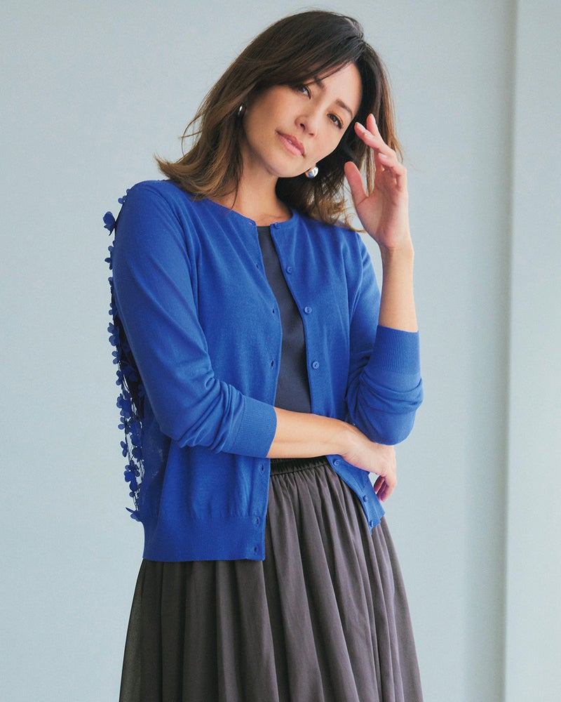 - 背中のお花が可愛い唯一無二のカーディガンです。お色も落ち着いていてどんなワンピースにも合うデザインが秀逸です。