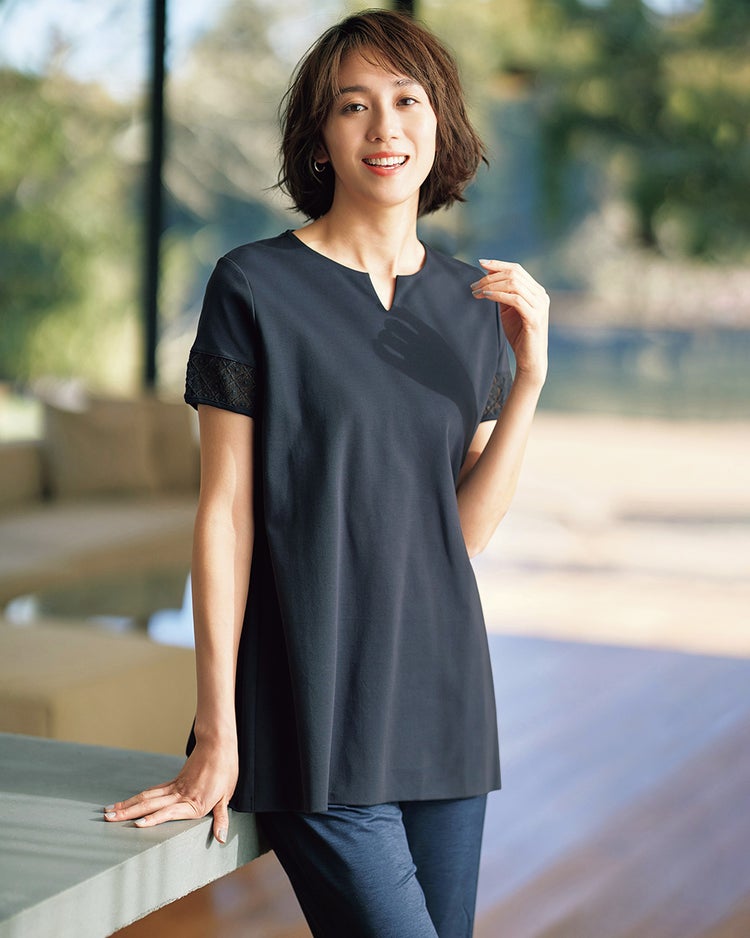 フェイスラインをすっきり魅せてくれるキーネックデザイン。体型カバー力に優れたほんのりフレアシルエットで、身幅にほど良いゆとりがあるから、汗ばむ季節も快適な着心地です。
