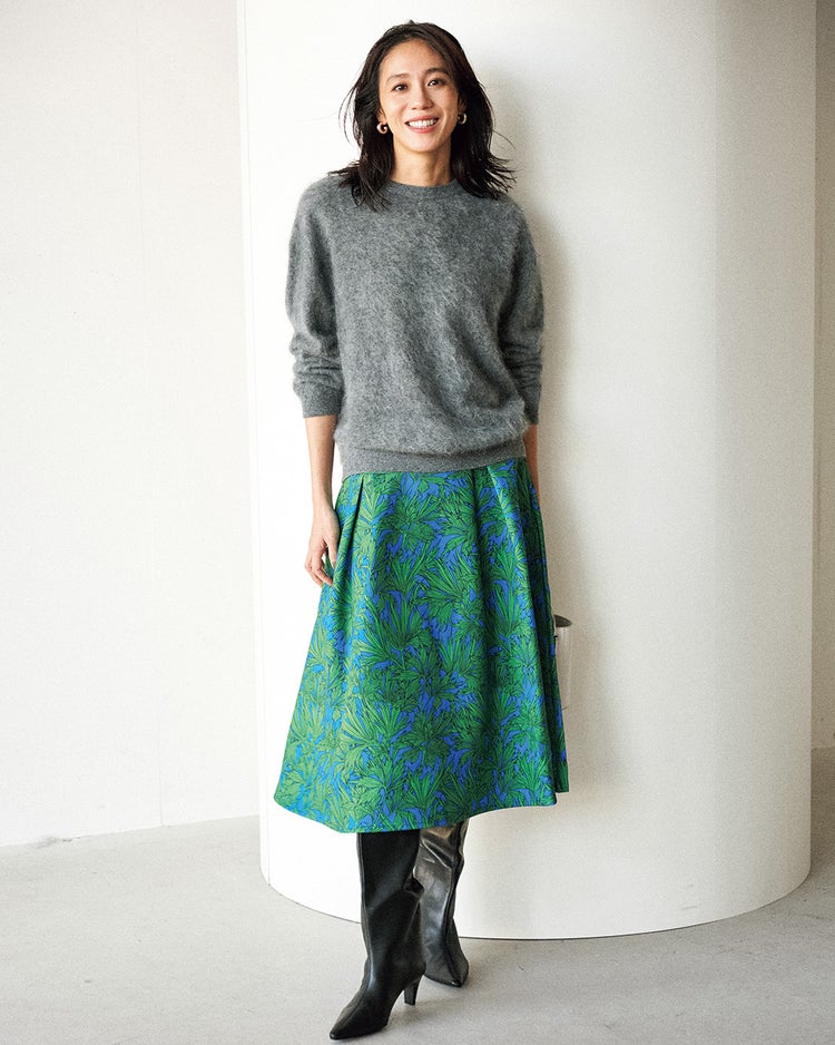 その場合、切替フレアスカートではなく同素材のAラインスカートの方がもしかしたらボリュームが出過ぎなくて良いのかも。