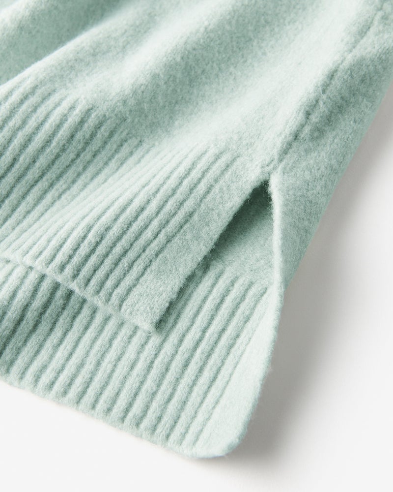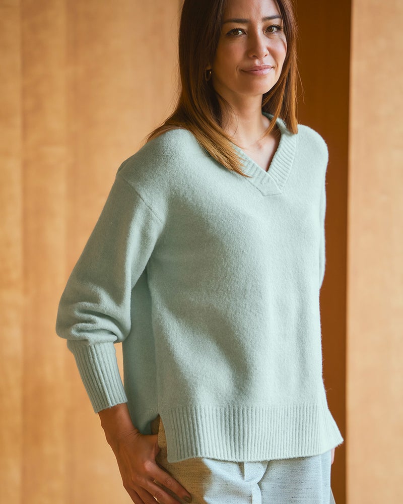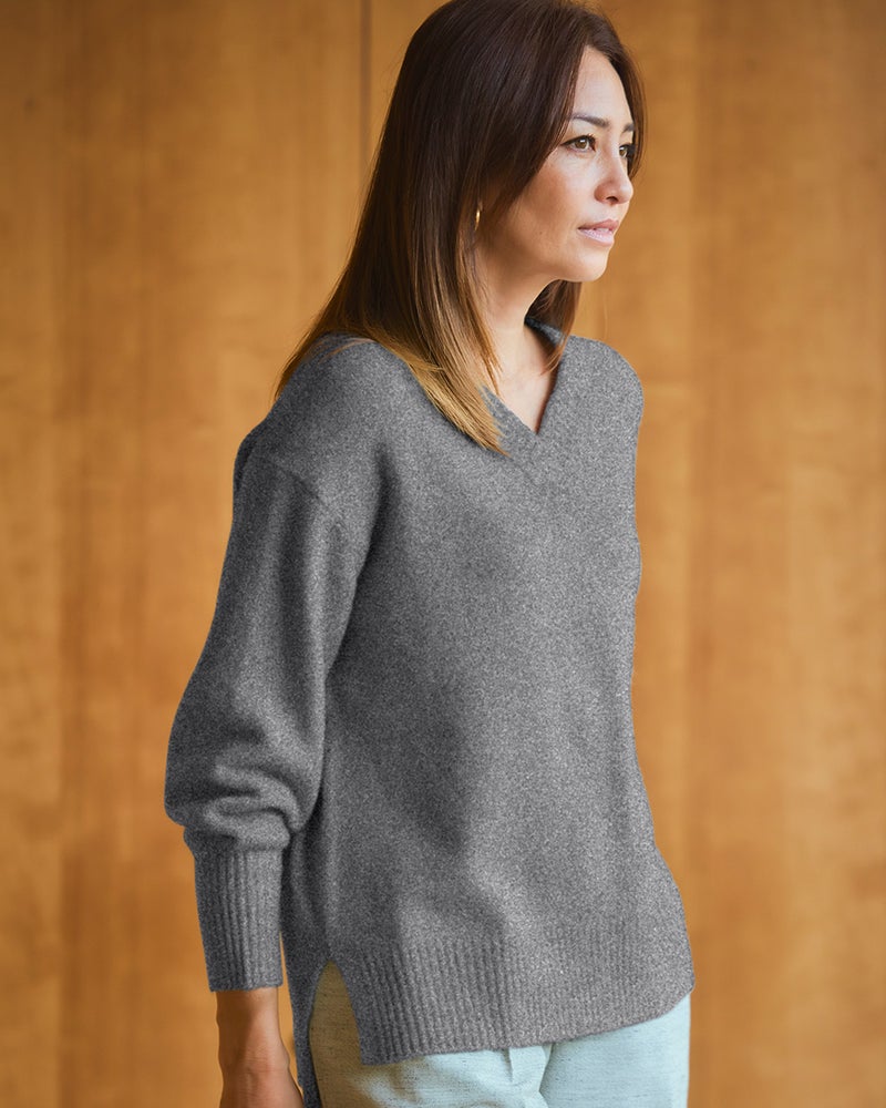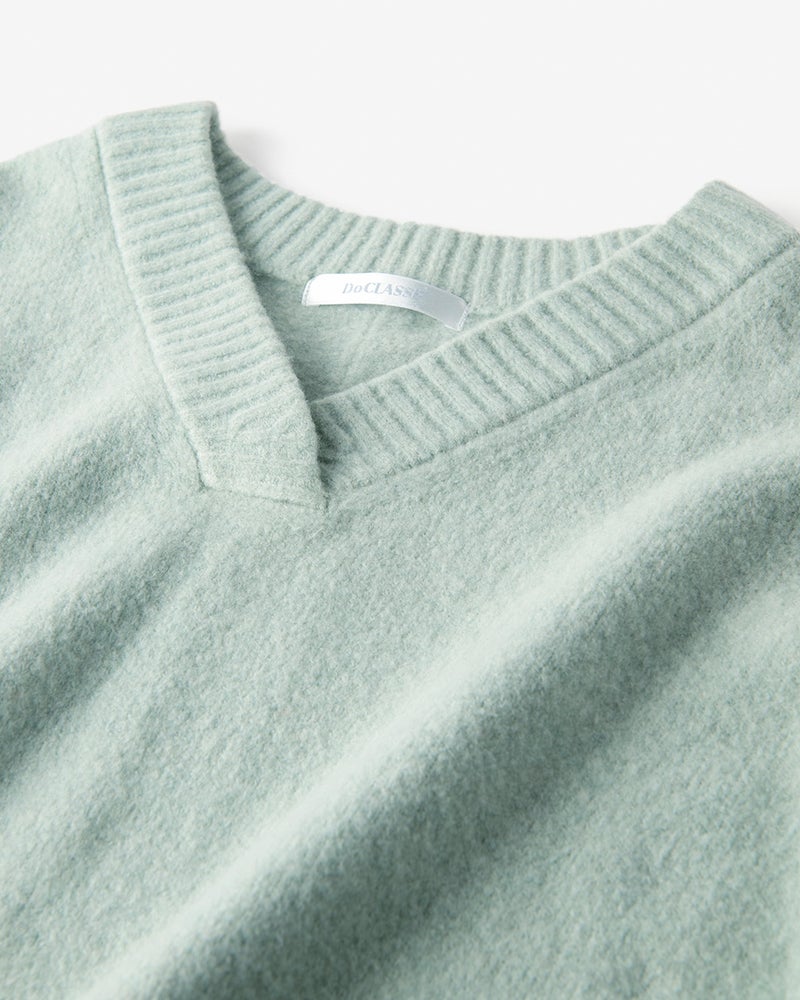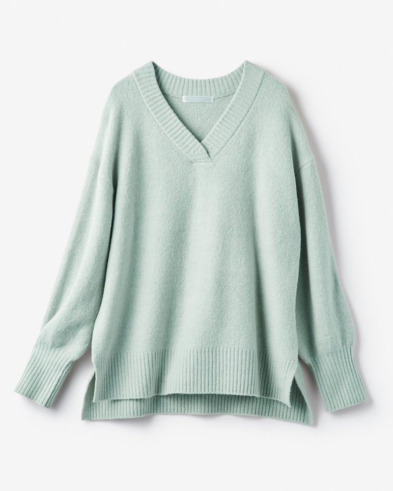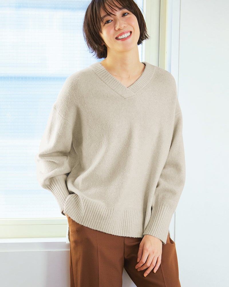 フワッとして手触りがとても良いです。襟付きのトップスがあまり好きではない私にとっては、Vネックでスッキリしてるし、丈もパンツにもスカートにも合う長さで、こんなセーター待ってましたって思うほど気に入っております。色の種類がもっとあれば即リピートしたいと思います。