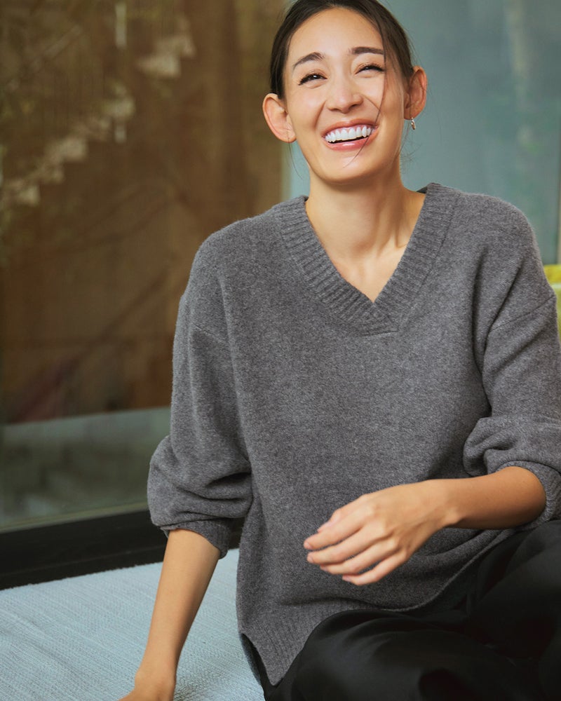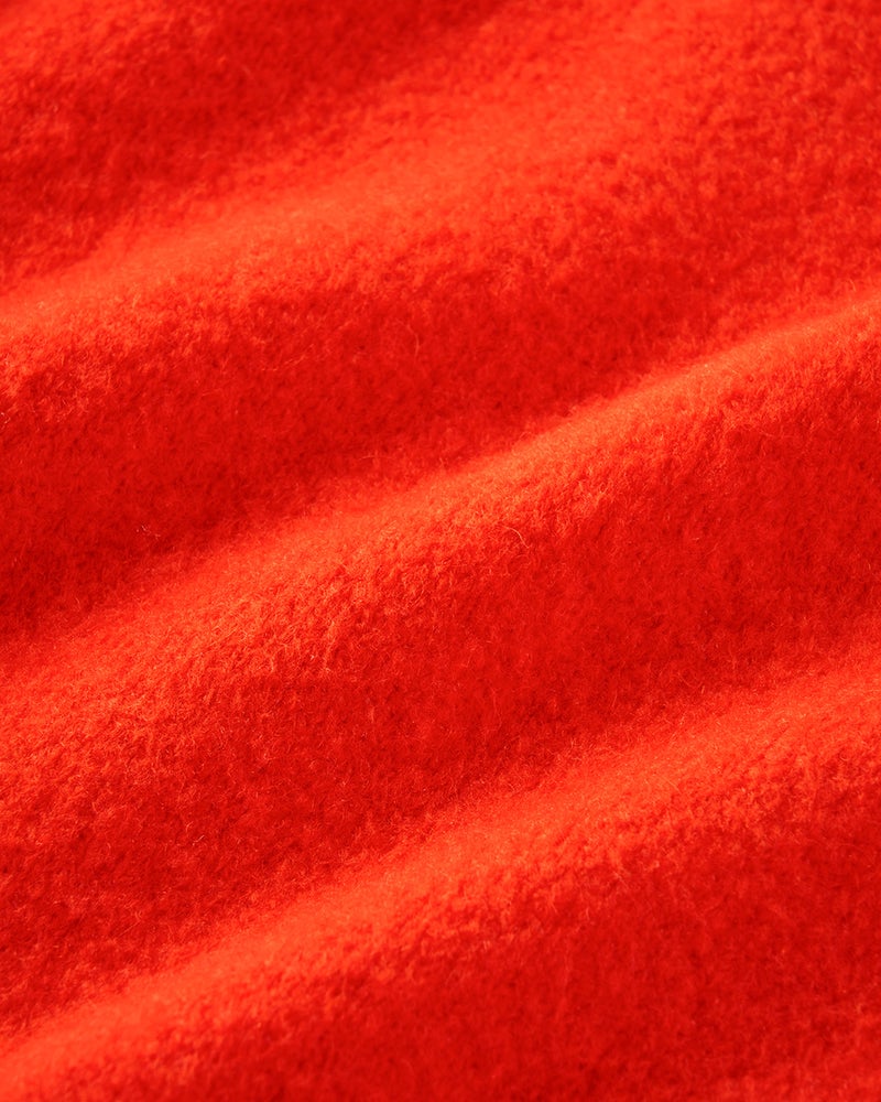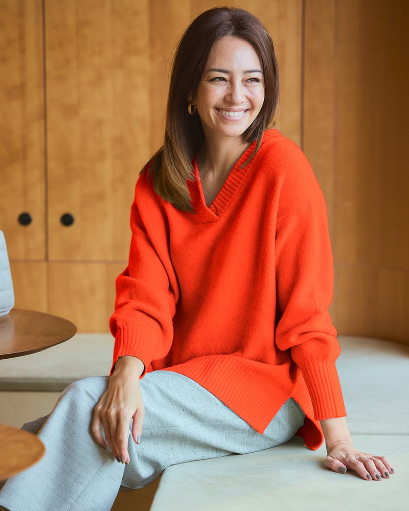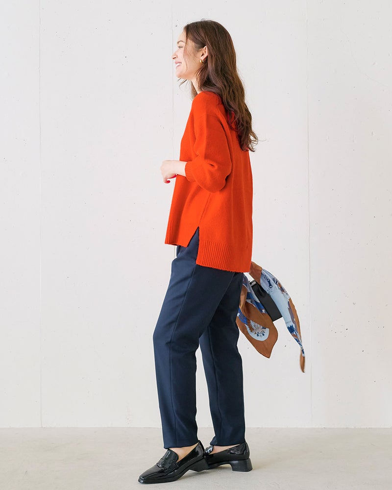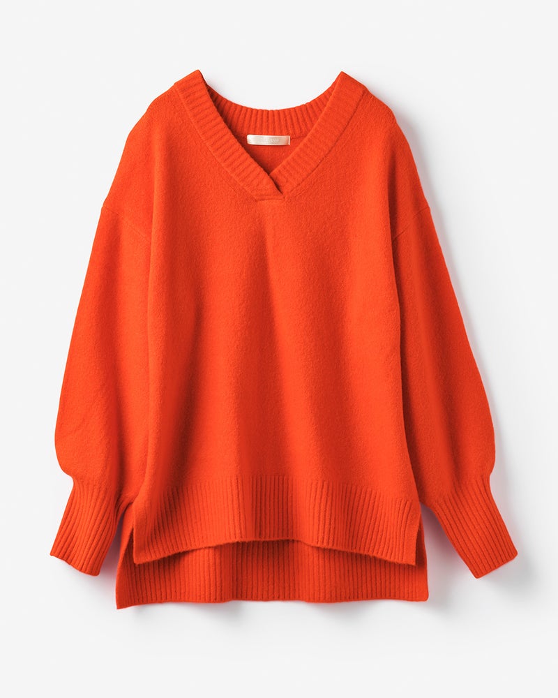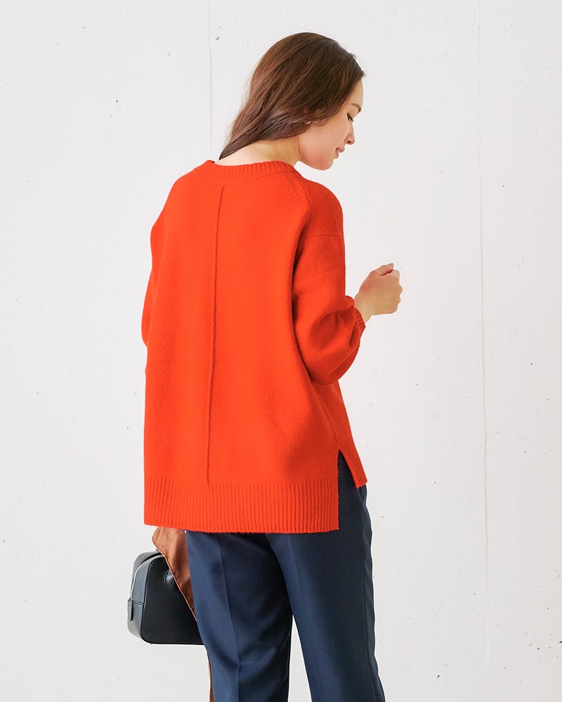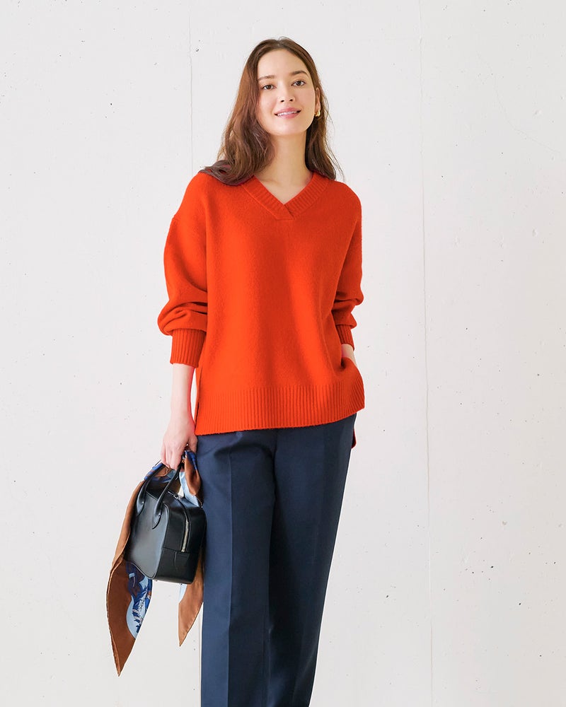 普段のサイズ:M 着用サイズ:S/M - 赤みがかったオレンジの発色がとてもきれいです。浅Vネック両サイドスリット、後ろ下がりのデザインでセーターなのにすっきり着こなせます。おしりが隠れるのもうれしいポイントです!
