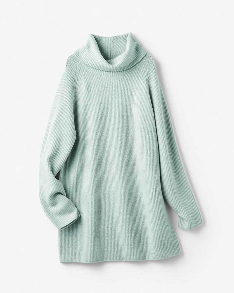 - 普段はMサイズですが、口コミを見て、Sサイズのパープルを購入しました。Sサイズでもゆったりしていて、袖も長く、「気をつけ」をした時、親指が隠れる長さでした。丈はお尻がすっぽり隠れ、太腿の真ん中まであります。生地がフワフワで暖かく、オフタートルなので、締めつけず、楽に着られます。この冬活躍しそうです。