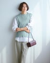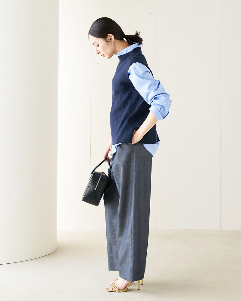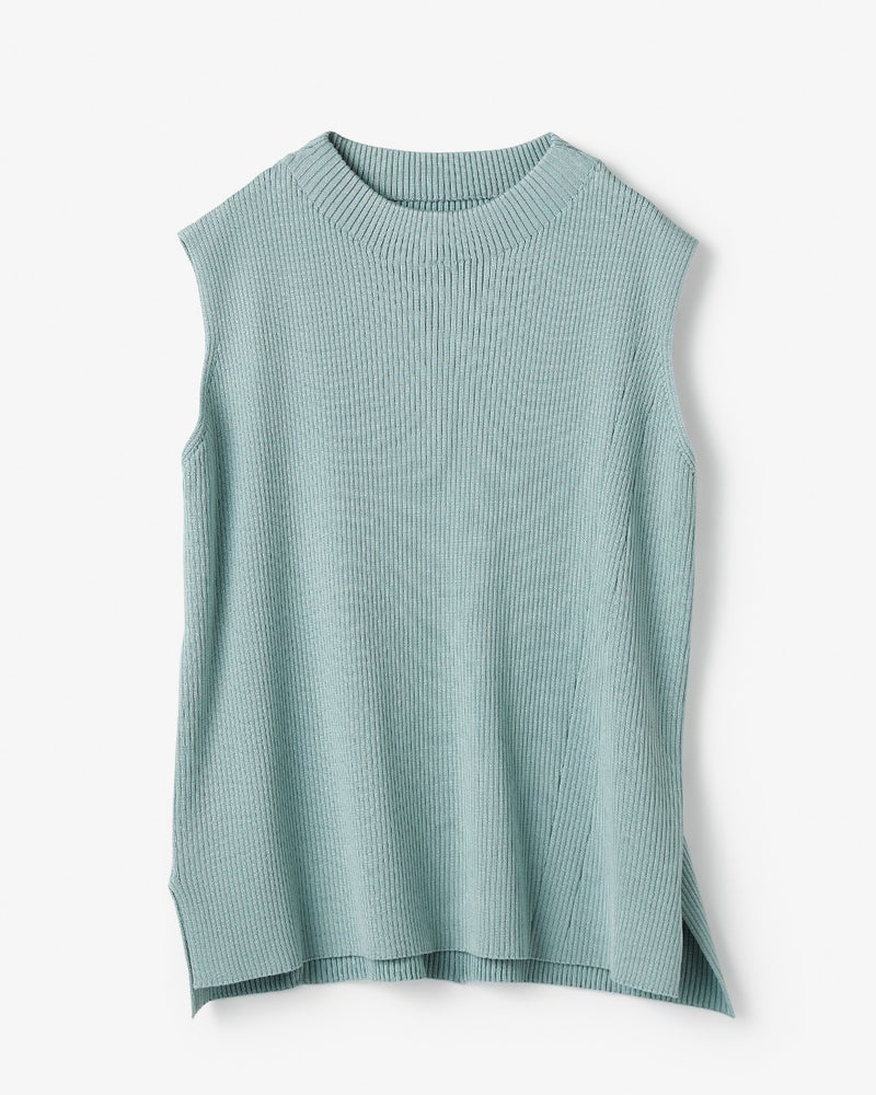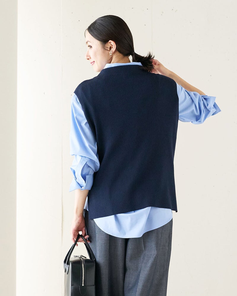 3シーズン活躍するノンウールのニットで仕立てたベストは、端境期にはアウター代わりに、屋内外の気温差が大きい季節には温度調節アイテムとして大活躍。