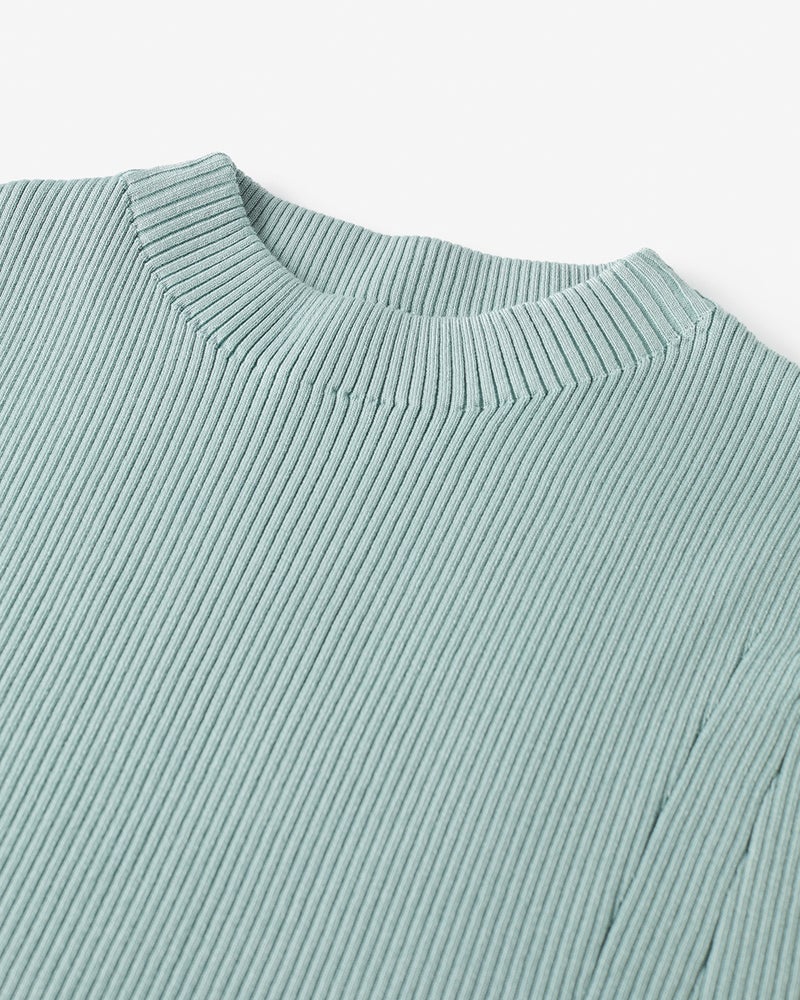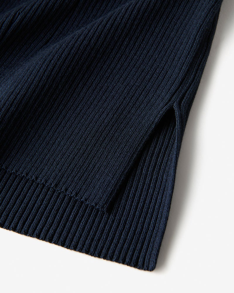 編み柄を活かした「着痩せニット」リブ編みの縦ライン、フロント左にあしらった斜めリブラインの視覚効果で、すっきり細見えを演出します。