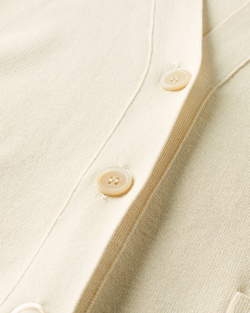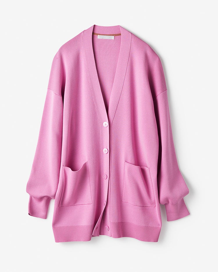体型を拾わないハリのある総針編みのカーディガン。トレンド感のある肩のラインを落としたシルエットや、ボタンを留めればセーター感覚で着られるデザインがポイントです。以前のモデルに比べて身幅をやや細くし、着膨れしない大人に着やすいシルエットに仕上げました。