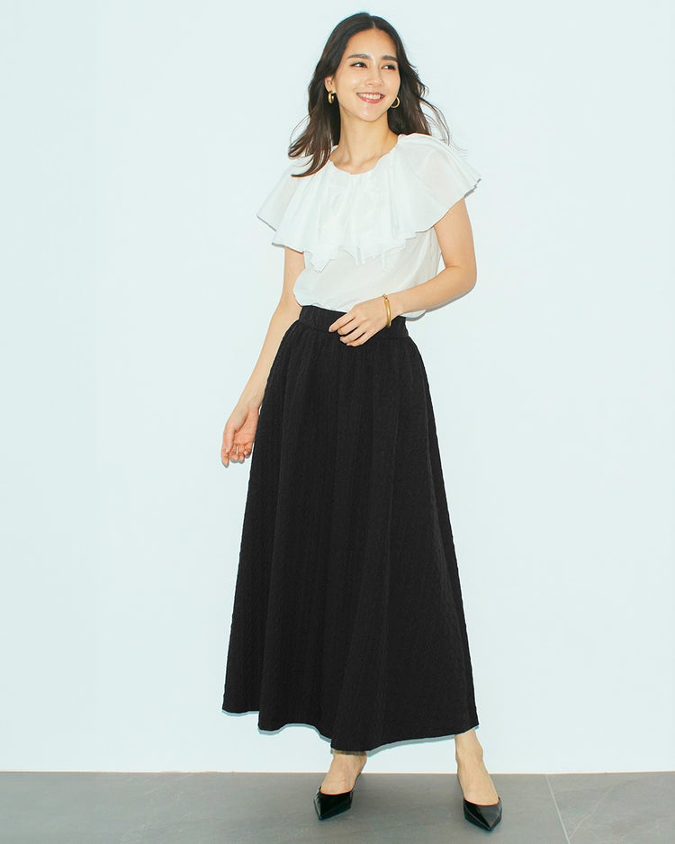 千鳥格子柄を立体的に表現したふくれジャカードのフレアスカート。たっぷり長さと量感のあるフレアスカートも、驚くほど軽やかな着心地です。ベルト芯に平ゴムを使っているから、お腹まわりはすっきり見えながらも、伸び伸びストレスフリー。両サイドには便利なポケットも装備しました。