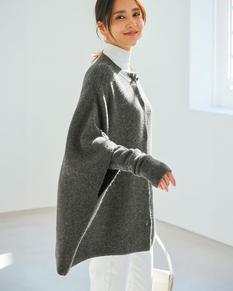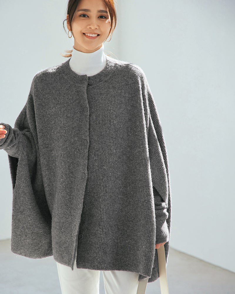 ネットで口コミを読み、店舗試着を申し込みました。紺とグレーで迷いましたが、グレーの方が顔写りが明るく感じられグレーSMを購入しました。柔らかい質感で軽いです。ポンチョとしても勿論ですが、前を開けてカーディガンとしてもいいかも、と思いました。アームカバーも付いてお得でした。
