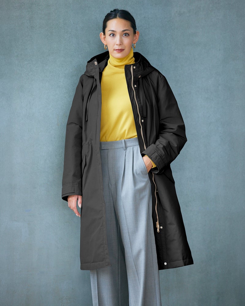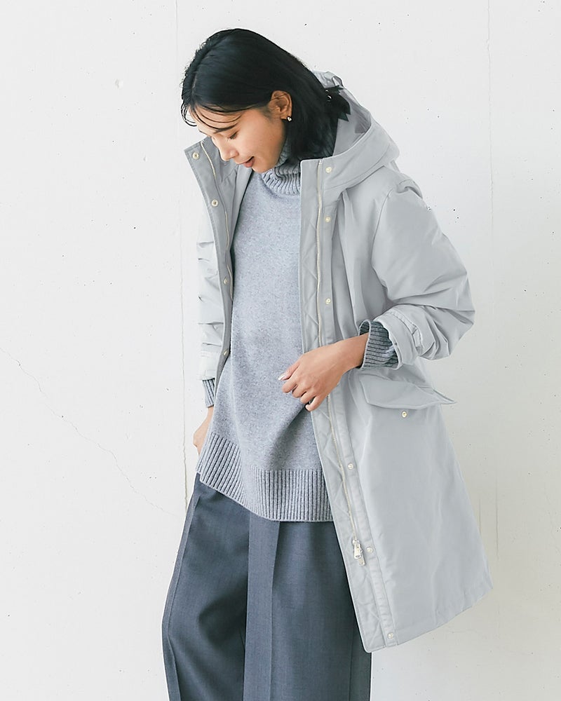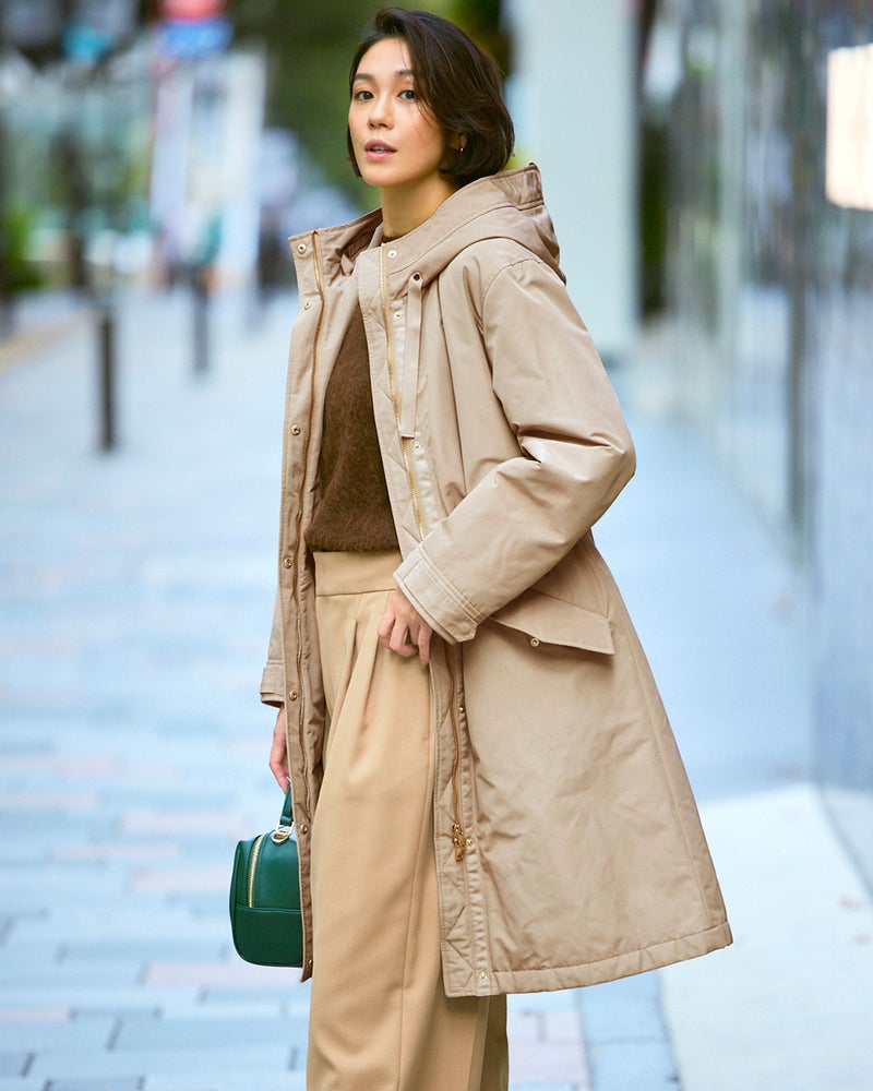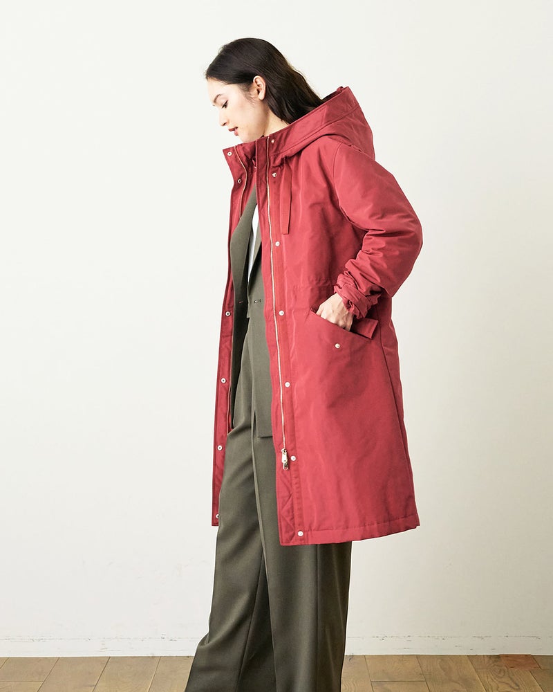 確かな暖かさと着膨れしないシルエットで大人気の「マジカルサーモ」を、内側から輝くような艶とハリのグログラン素材で作りました。顔まわりに立体感をもたらすフードは小顔効果抜群。スナップボタンやファスナーなどのディテールまでリッチに仕上げています。