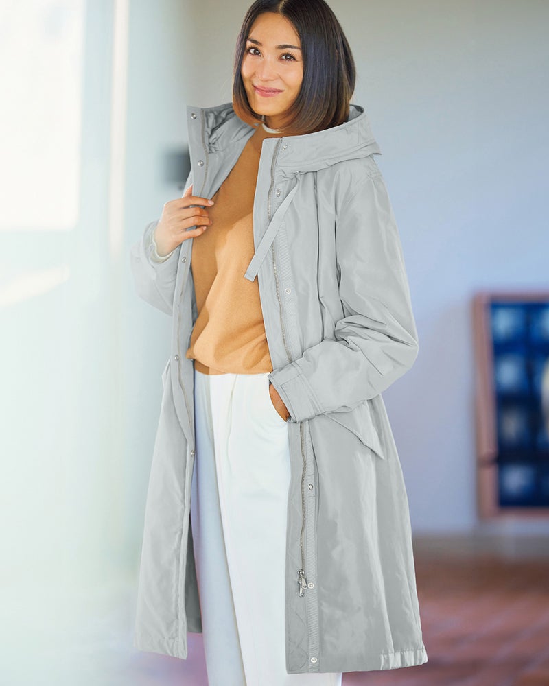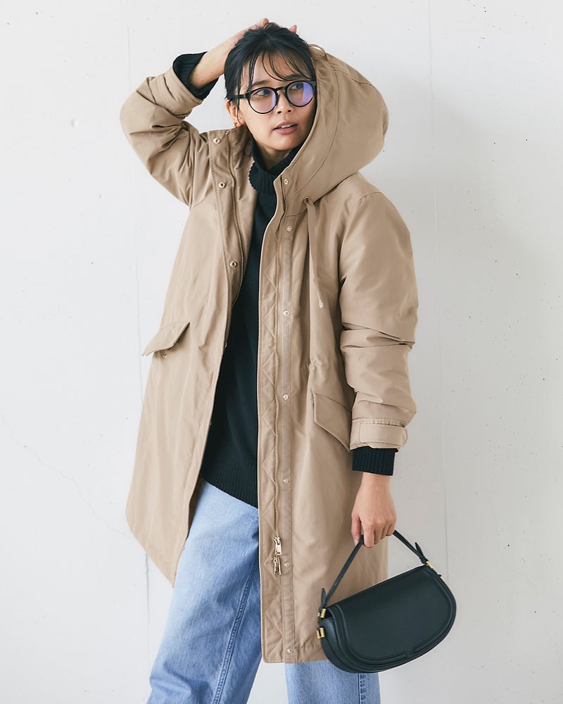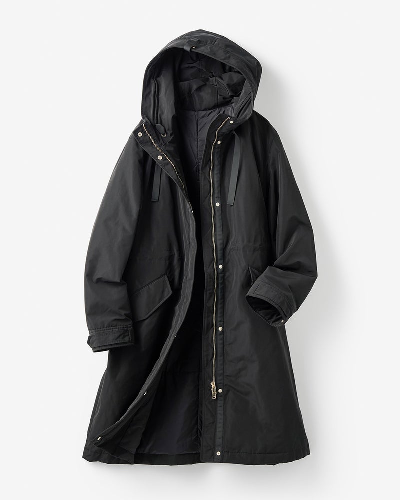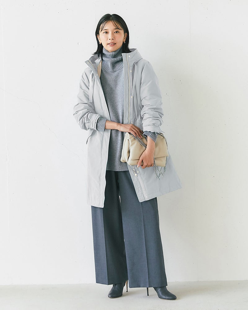 確かな暖かさと着膨れしないシルエットで大人気の「マジカルサーモ」を、内側から輝くような艶とハリのグログラン素材で作りました。顔まわりに立体感をもたらすフードは小顔効果抜群。スナップボタンやファスナーなどのディテールまでリッチに仕上げています。