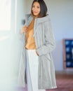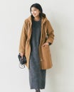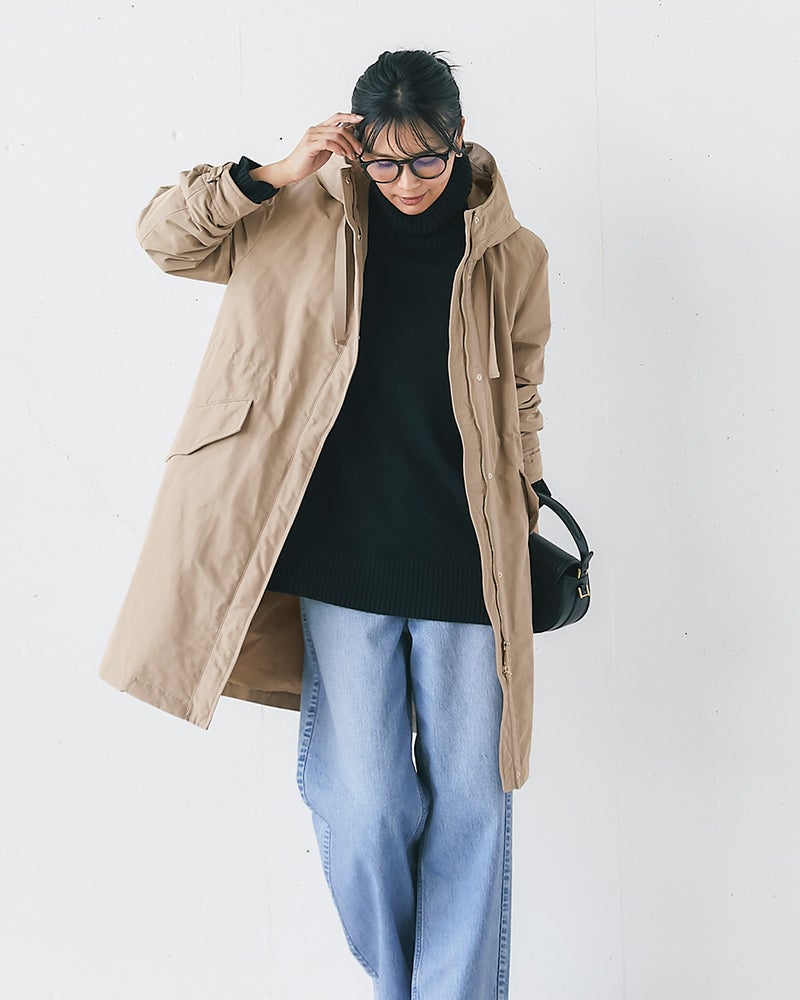 生地の光沢に高級感があり、グログランテープもおしゃれです。フードがいらない時はボタン留めで折りたためるので、ショルダーバッグを斜め掛けした時もフードに引っ掛かりにくいですし、首回りがおしゃれです。ロングコートなのでファスナーをする時に下の方まで手をもっていかないといけないのですが、ダブルファスナーで下から開けることができ、足さばきがとてもいいです。