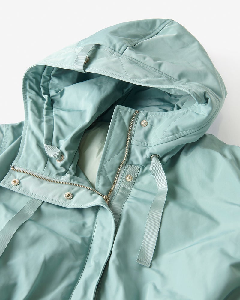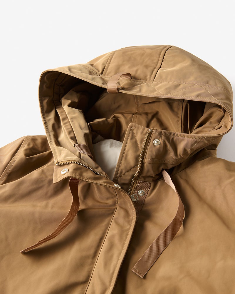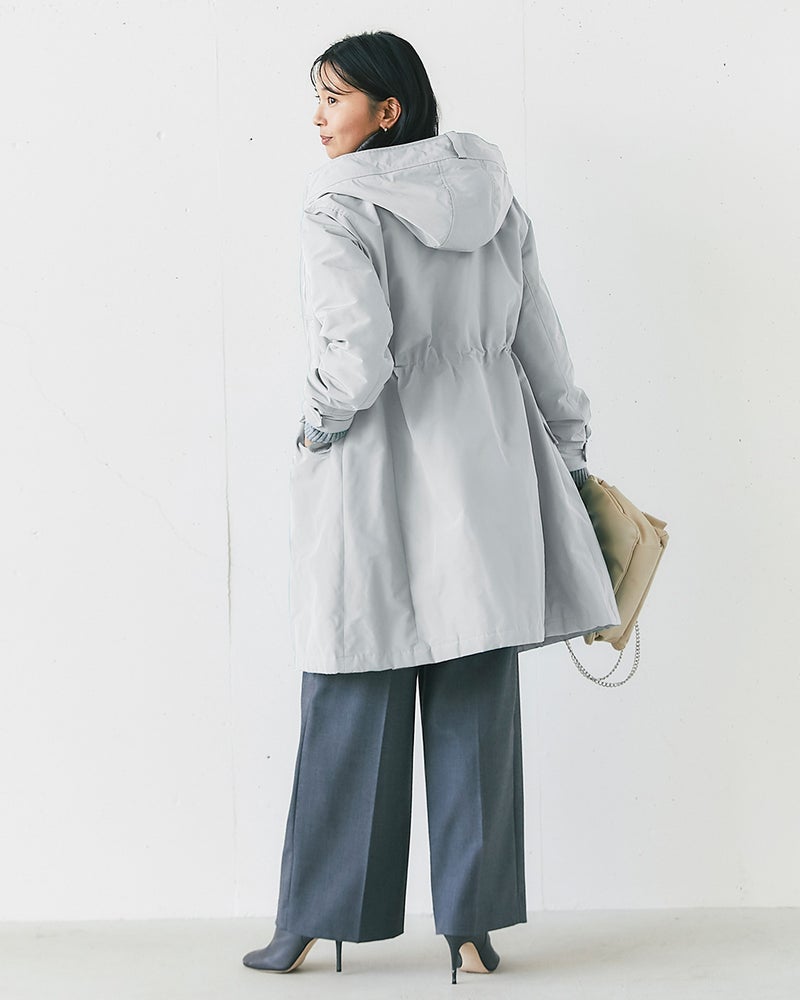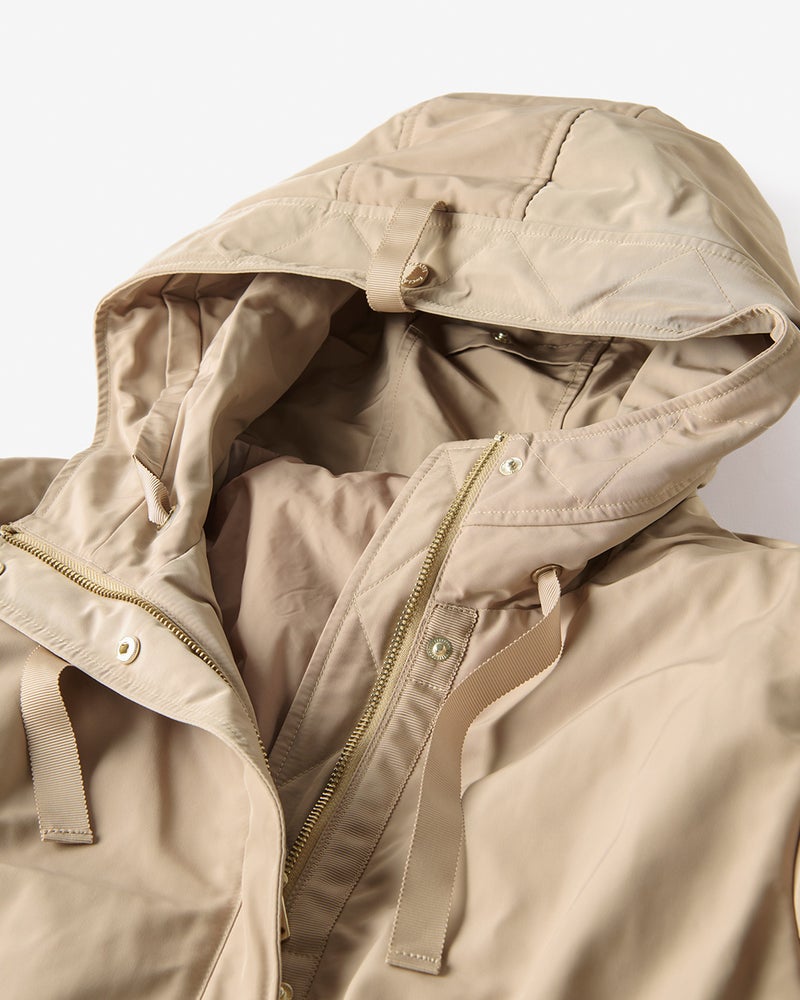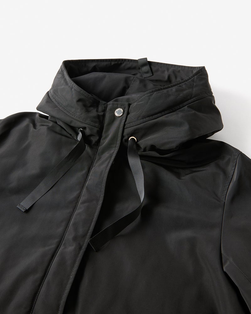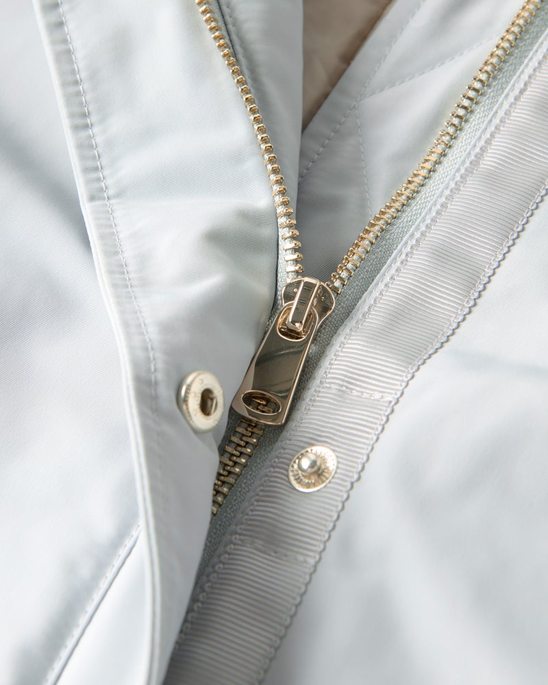 艶とハリのある、グログラン生地でもっと美しく緻密に織りあげた、ハリと艶の美しいグログラン素材をオモテ面に採用。より上質で、フォルムの美しさが際立つ1着に。オモテ面は雨や雪をはじく撥水加工済。裏面は光沢感のあるタフタ素材で、よりカジュアルな印象に。