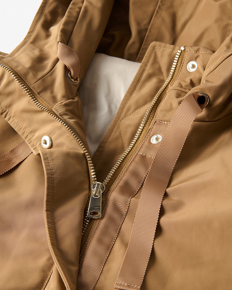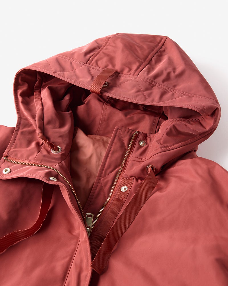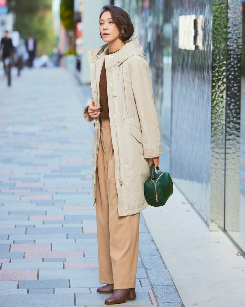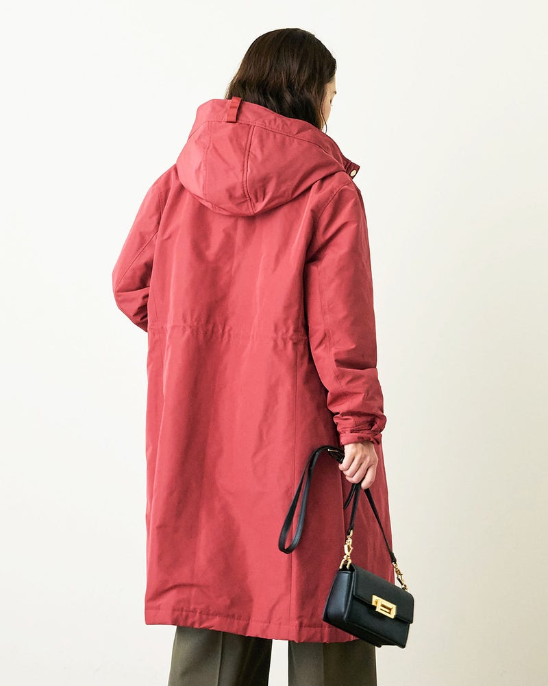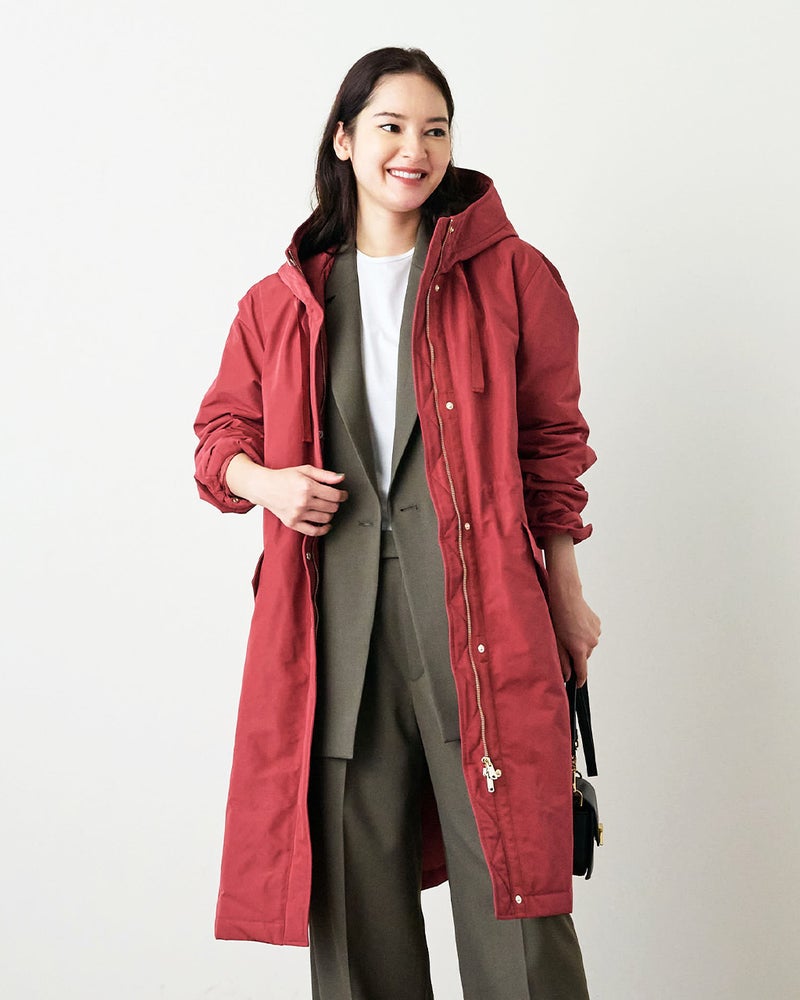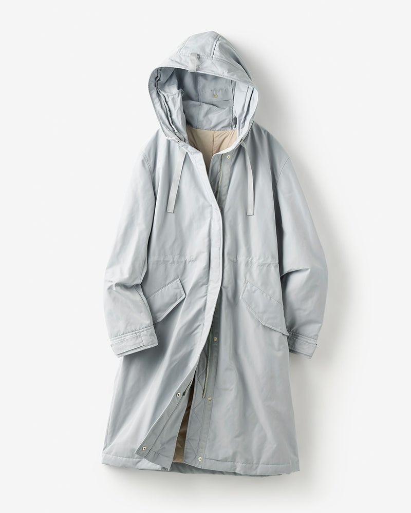 艶とハリのある、グログラン生地でもっと美しく緻密に織りあげた、ハリと艶の美しいグログラン素材をオモテ面に採用。より上質で、フォルムの美しさが際立つ1着に。オモテ面は雨や雪をはじく撥水加工済。裏面は光沢感のあるタフタ素材で、よりカジュアルな印象に。