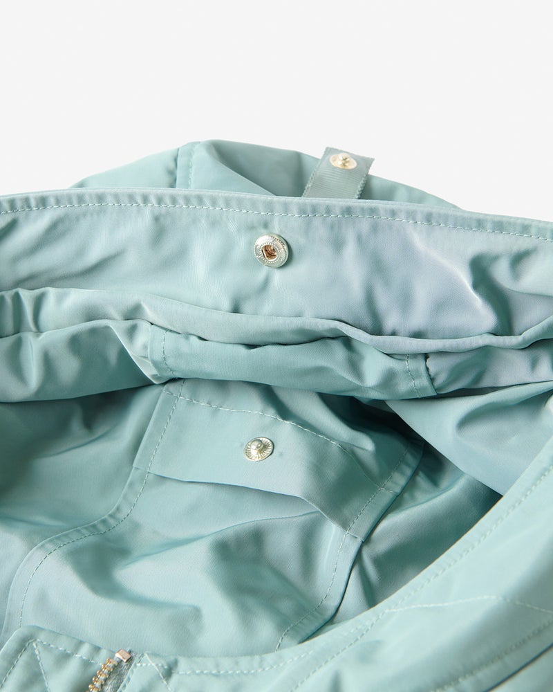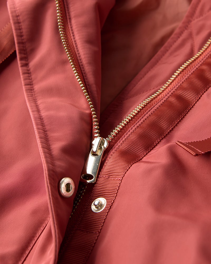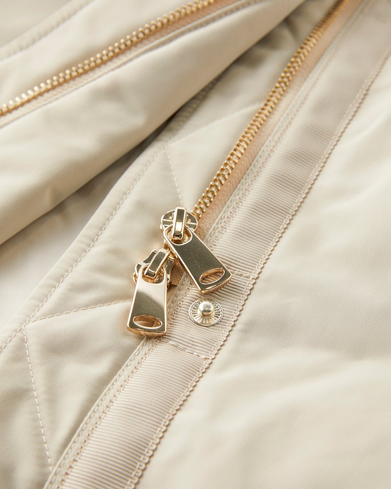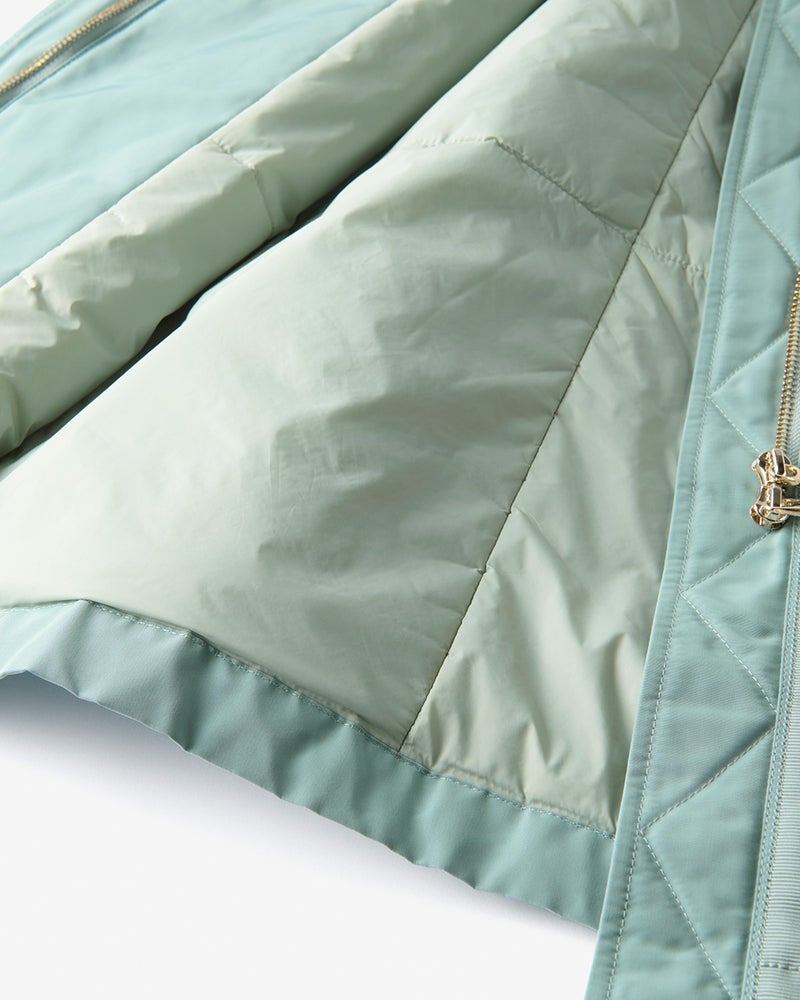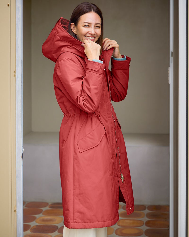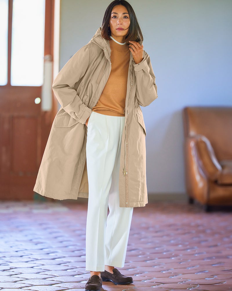 艶とハリのある、グログラン生地でもっと美しく緻密に織りあげた、ハリと艶の美しいグログラン素材をオモテ面に採用。より上質で、フォルムの美しさが際立つ1着に。オモテ面は雨や雪をはじく撥水加工済。裏面は光沢感のあるタフタ素材で、よりカジュアルな印象に。