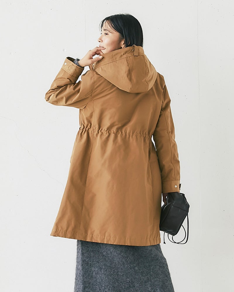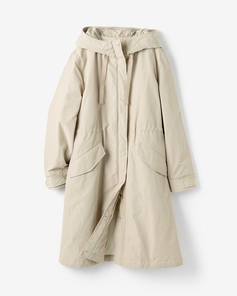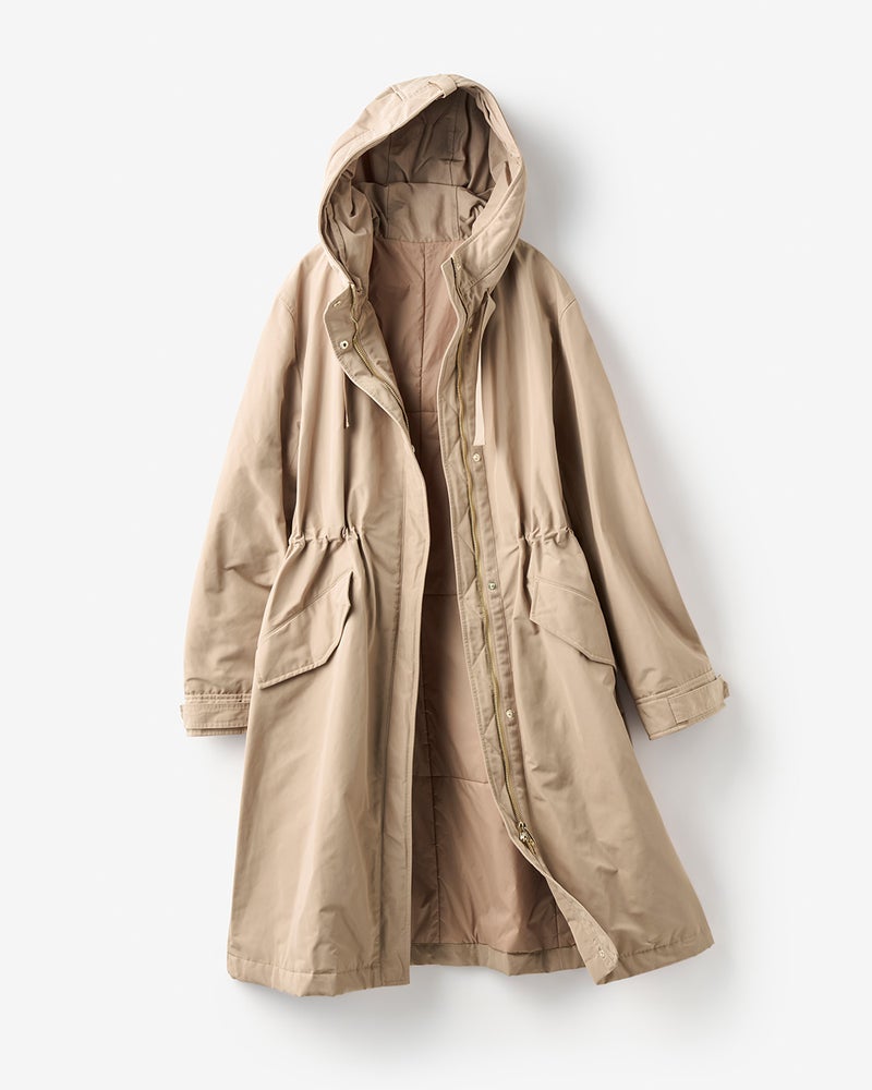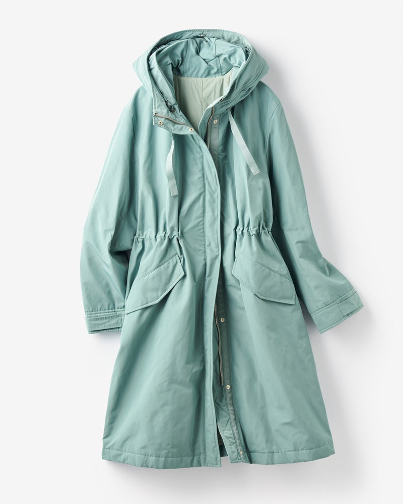 店頭のマネキンがキャメルを着ていて凄くキレイなラインでいつも通るたびに気になっていました。実際着てみると凄く軽く、撥水加工や油分を弾くコーティングもされているようで機能性も抜群でした。風も通さないのでこれからの季節重宝すると思います。ウエストが絞れたり、フードが折りたためたりとデザインも素敵です!ライトグリーンもキレイな水色という感じで暗くなりがちな冬でもキレイに着こなせます。気に入って同時にグレーベージュも買いました!他の色も欲しいくらいです。キャメルや黒も欲しいです。