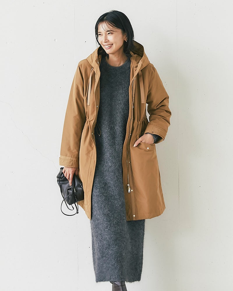 - グレーベージュ(S)を購入しました。商品説明にある通り軽くて暖かい!お洒落なシルエット、ボタンやファスナーも高級感があり、ウエストが絞れてスリムに着られます。色合いもとても上品で、とても気に入りました(珍しく主人にも褒められました)。いつものサイズで、厚めのカーディガンの上に着ても余裕があります。昨シーズンはマジカルサーモのリバーシブル(着丈が短め)を購入し大変重宝しました。このグログランは丈が長めなので、お出かけ用や寒さの厳しい日に着ようと思います。楽しみです!
