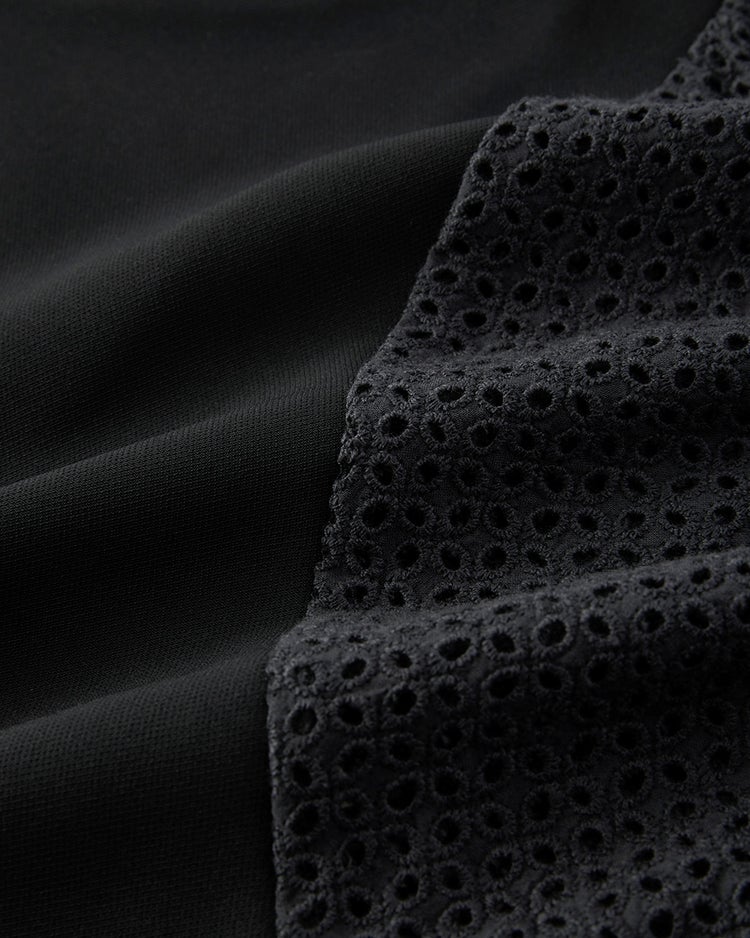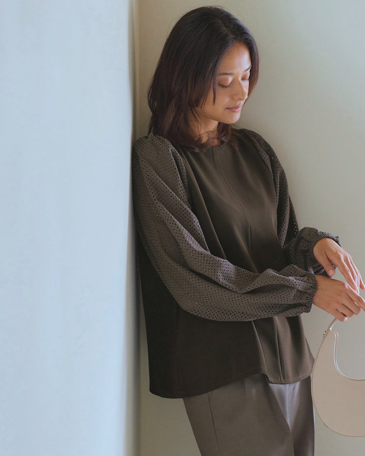 はじめはダークトープを購入しましたが、着てみてあまり合っていないように思って、ブラックに変更しました。袖部分が総カットワークになっているので、着る日に迷いました。インナーを着てしまえば11月くらいまで着れるかな…と思っていましたが、思ったよりインナー選びがうまくいかず、着用回数は少なめです。感覚としては半袖扱いと考えた方がいいかもしれません。