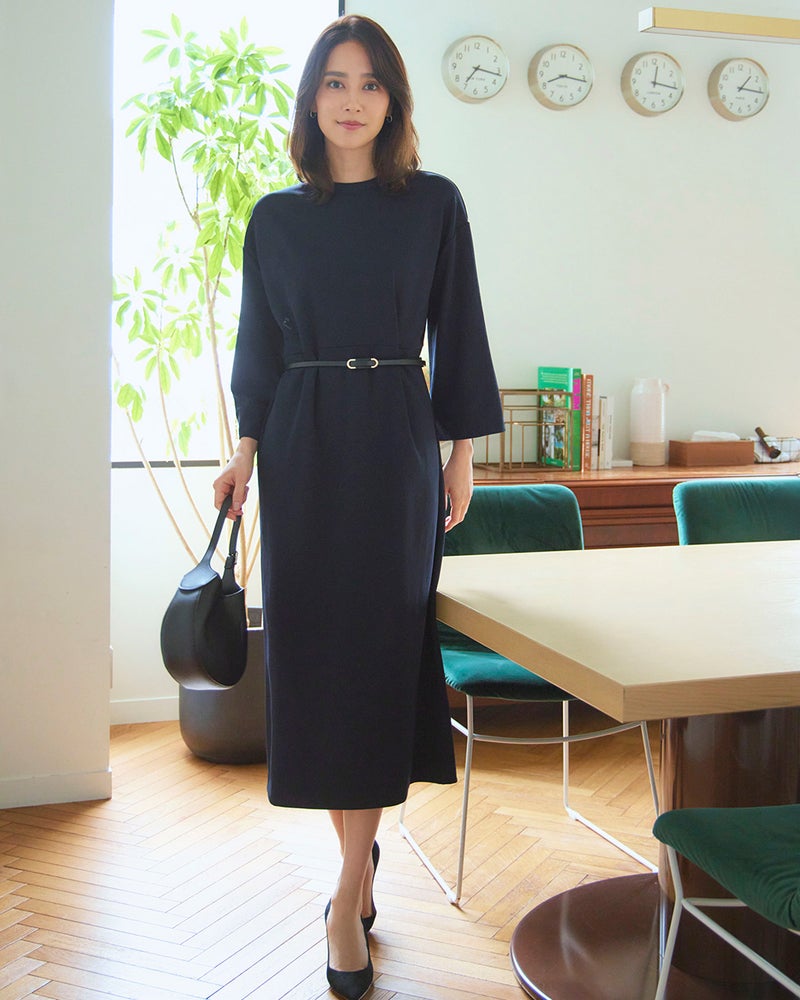 - 163センチ、ふだんL〜LLの中年体型ですがこれを着るとスッキリ見えします。付属のベルトのおかげでストンとし過ぎず、体型が目立たず、かつスッキリしたデザインなので細見えマジックです。首回りはすこし狭いです。スカーフを巻いたりして保護者会や会食に活躍しています。