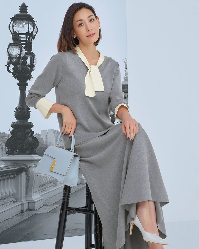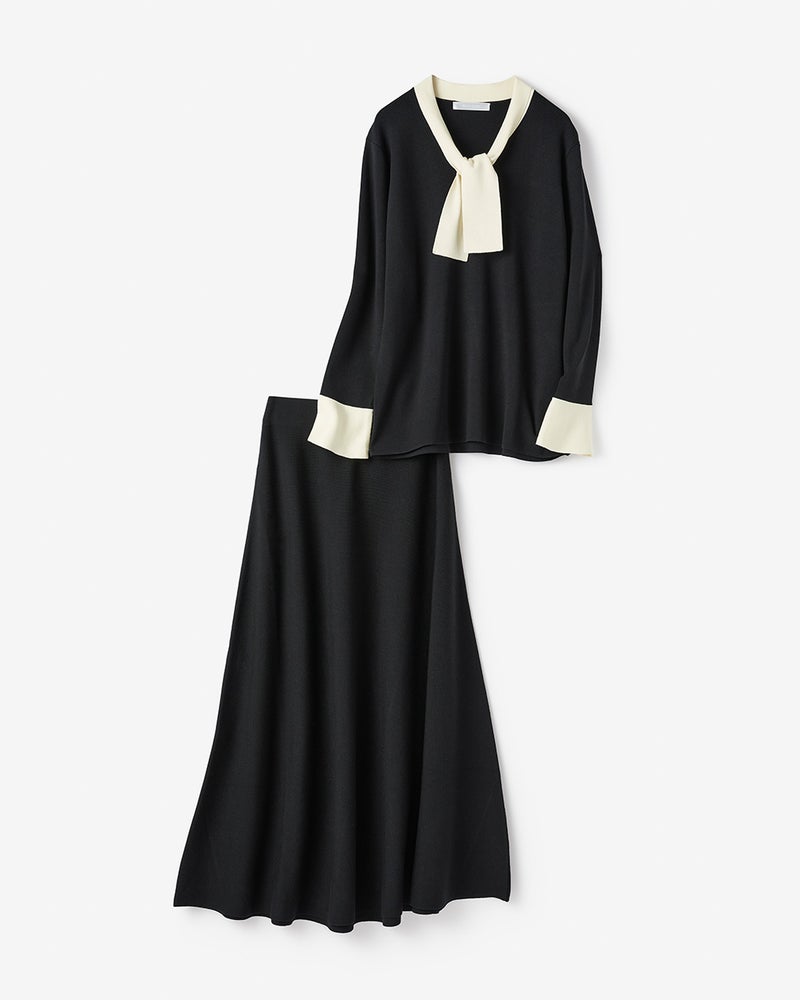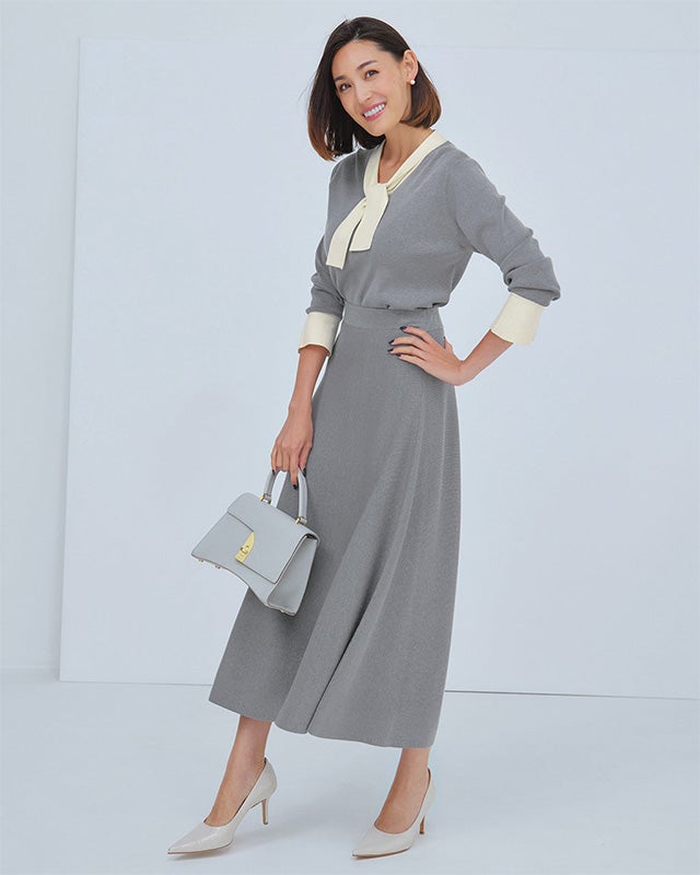 • 白のボウタイ&カフスがノーブルで華やかなトップスと、腰まわりすっきりのフレアスカート。そんなエレガントなセットアップも、ふっくらコシのあるニットで仕立てたら、ぐっとストレスフリーな着心地になりました。