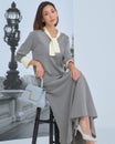 最初はブラック希望でしたが売り切れていましたので、グレーを選択。発表会の服を探していたのですが、こちらの色の方が爽やかさと優しさがでていたのか生徒さんのお母さまから「素敵なお召し物で!」と言って頂きました。ただ、ボウタイニットとスカートのサイズを別々に選べれば良かったかと。Mを購入し、スカートは丁度良かったのですが、上のニットの首の空き具合など少し不安がありました。でも全体的にすっきりしていてお気に入りになりました。