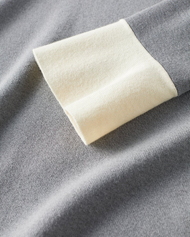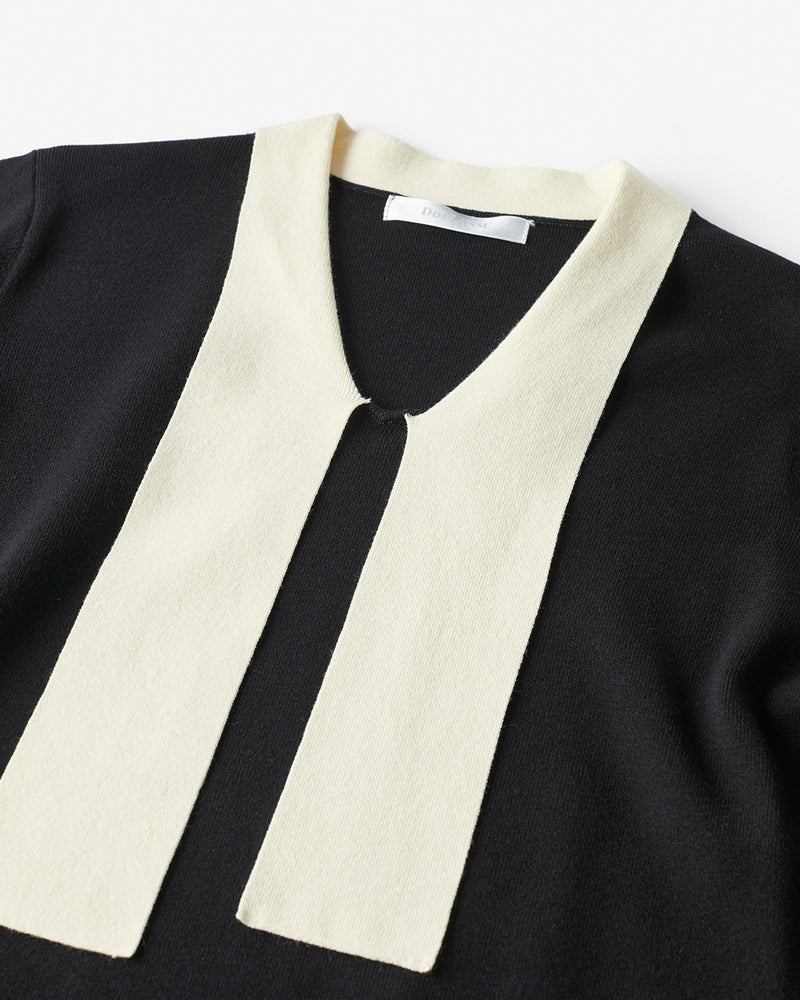 配色のボウタイで彩ったプルオーバーニット。カフスもバイカラー仕立てで、ほんのりフレアなシルエットがクラシカルなデザインです。