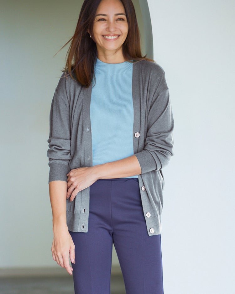 イタリア・ZEGNA BARUFFA社製の極細番手メリノウールニット素材。ゆったり着られるVネックカーディは肩に羽織っても美しいデザインに。