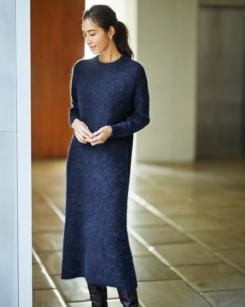 お出かけにも休日にも似合うニットワンピース。アルパカニットならではの、ふわふわのヘアリーな質感が上質感と女らしさを演出。身体を締め付けないすとんとしたニットワンピースは、楽な着心地なのに可愛くなれる冬に嬉しいアイテム。すっきりと首に沿うファネルネックもお洒落のポイントです。