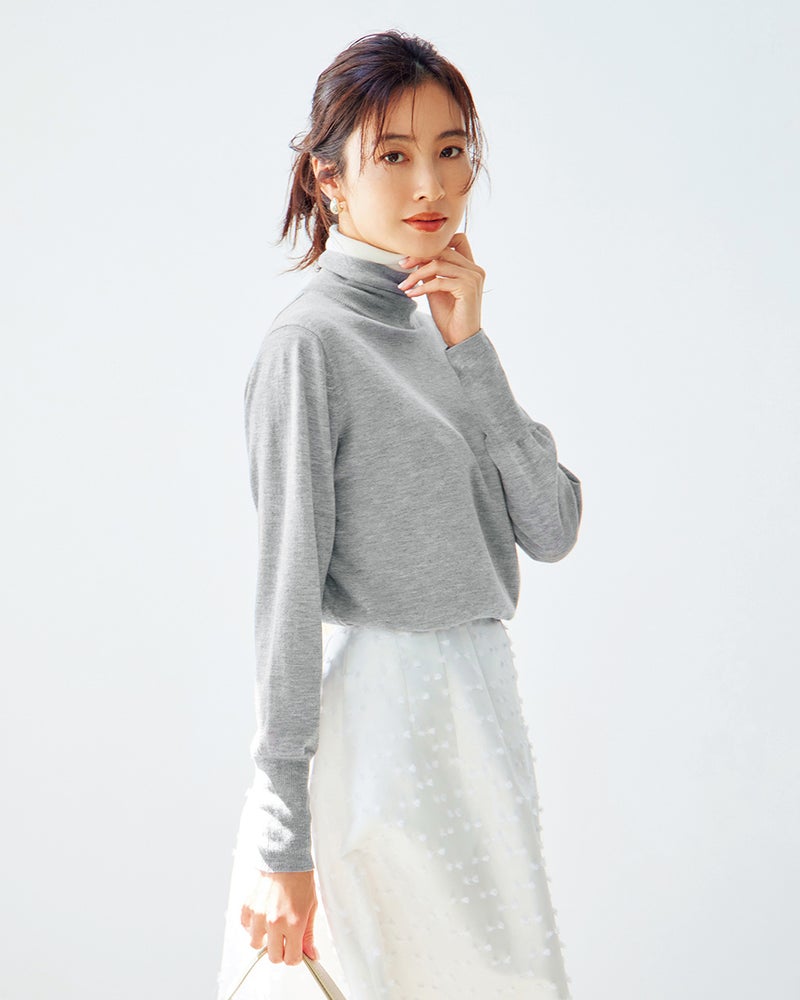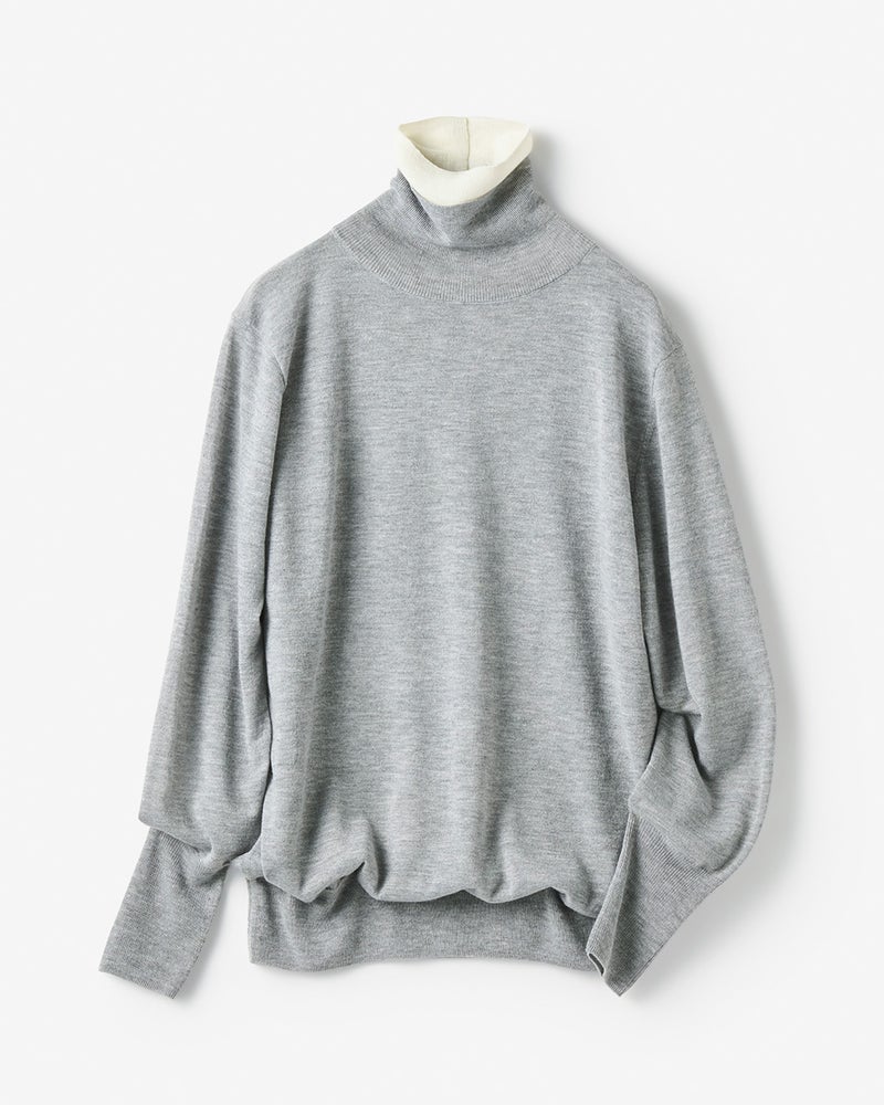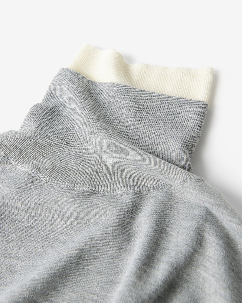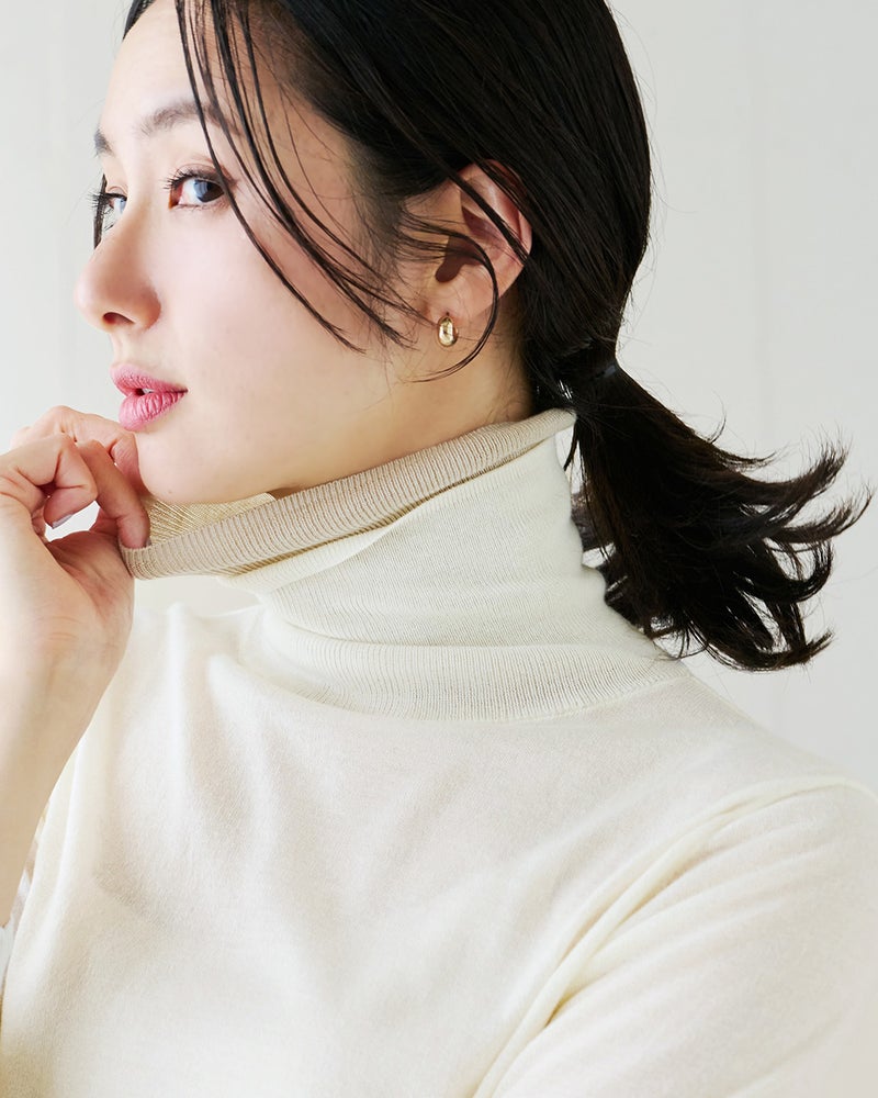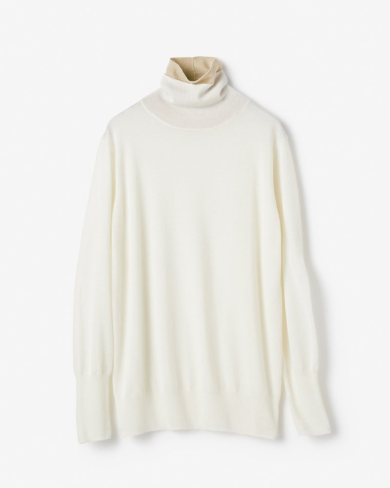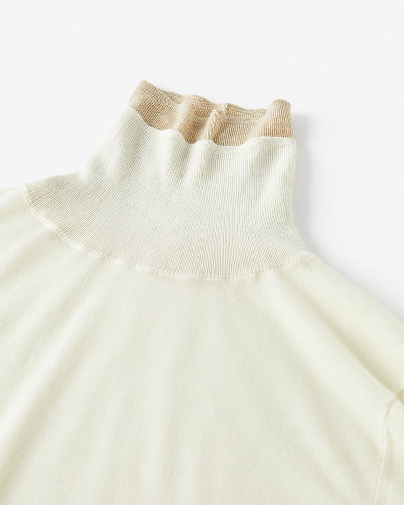 身頃は天竺編み、二重仕立てのタートルネックは心地良く首筋にフィットするリブ編み仕立て。首もとの配色使いで、シンプルながらも華やいだ印象に。