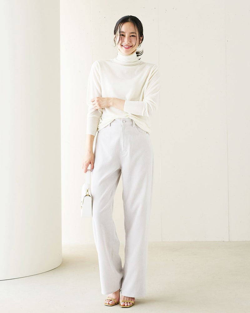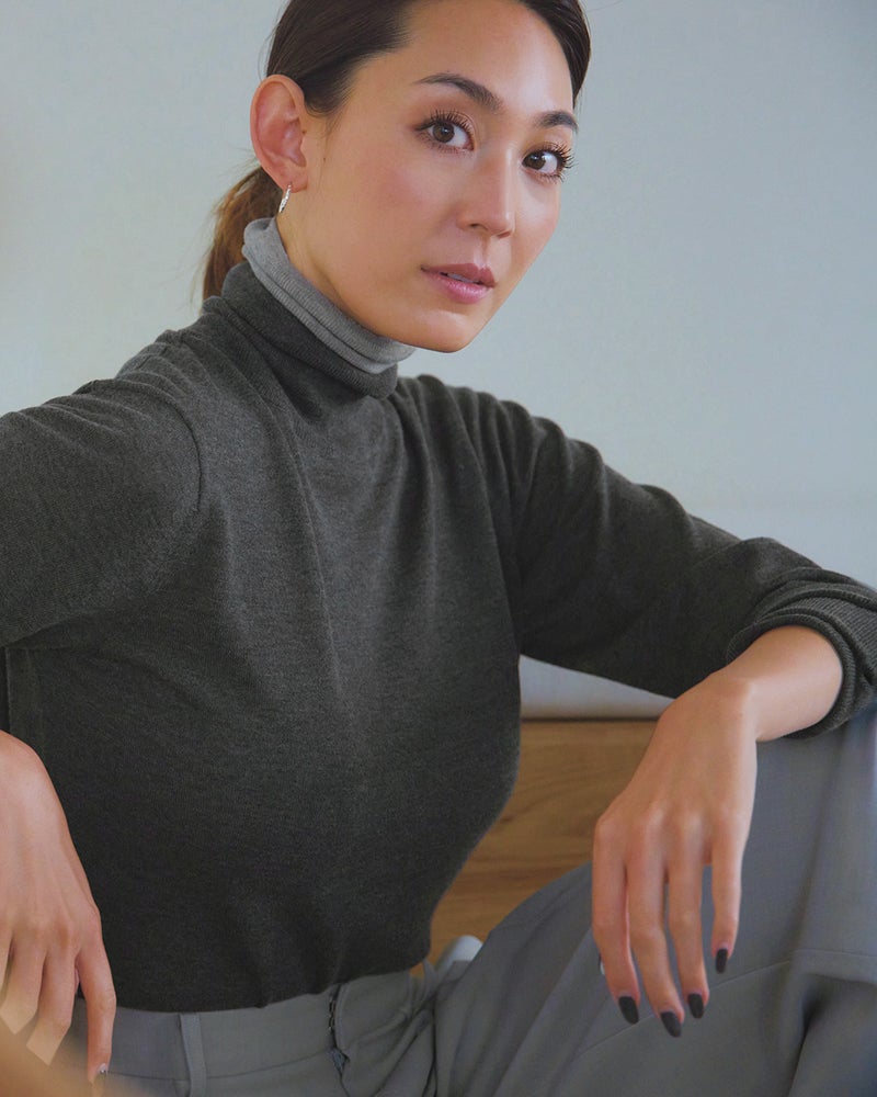 薄手ですが身体にフィットしすぎず、でもシルエットはとてもきれいで、なによりネック部分のダブルタートルがすごくいいフォルムです。秋から春まで長く着用できそうです。