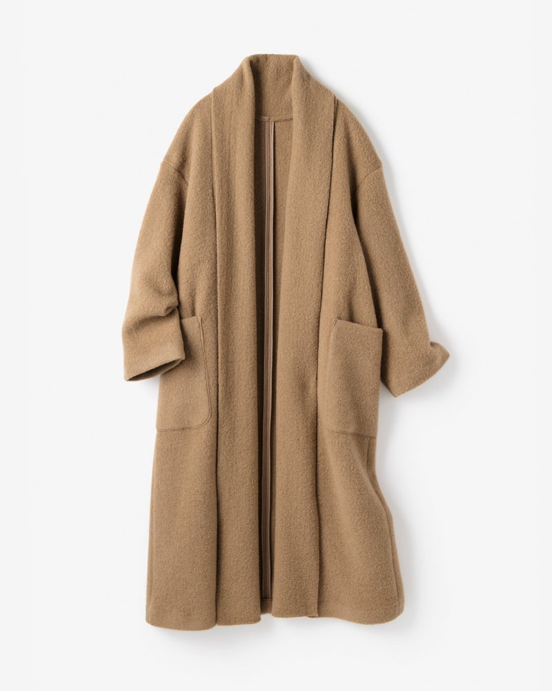 ふわっと軽いピュアウールを空気を含ませながら織り上げた大人のためのスペシャリティフリース素材。ふっくら起毛したバルキーな質感と、カジュアルにもきれいめにも着こなせる大人のデザインで作り上げました。ショール風の衿が可愛いロングコートは、ゆったりめのシルエットが今っぽい抜け感を演出。ボタンなし、裏地のなしのライトな仕立てで気負わず着こなしていただけます。