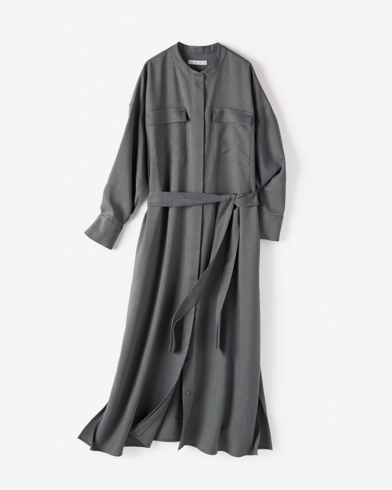 すとんとしたシルエットでシンプルに仕立てたバンドカラーシャツワンピは、サキソニー素材ならではのとろみ感で女らしさをプラス。共布ベルトでウエストシェイプしたり、インナーにタートルを合わせてレイヤーを楽しむなど、幅広い着こなしも魅力。
