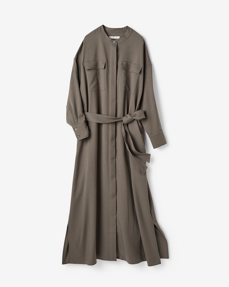 すとんとしたシルエットでシンプルに仕立てたバンドカラーシャツワンピは、サキソニー素材ならではのとろみ感で女らしさをプラス。共布ベルトでウエストシェイプしたり、インナーにタートルを合わせてレイヤーを楽しむなど、幅広い着こなしも魅力。