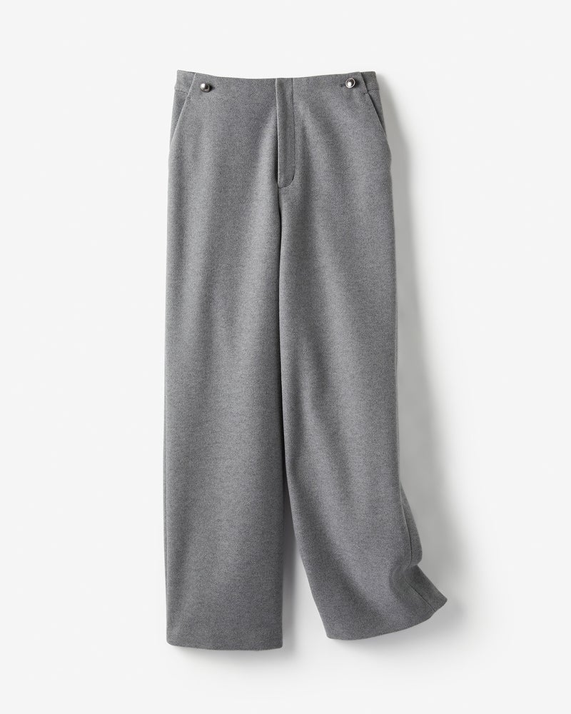 ウエストベルトのない洗練されたデザインで、サイドの金ボタンが腰を高く見せてくれるセミワイドパンツ。あえてセンタープレスを入れず、スニーカーにも似合うデザインにしています。