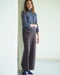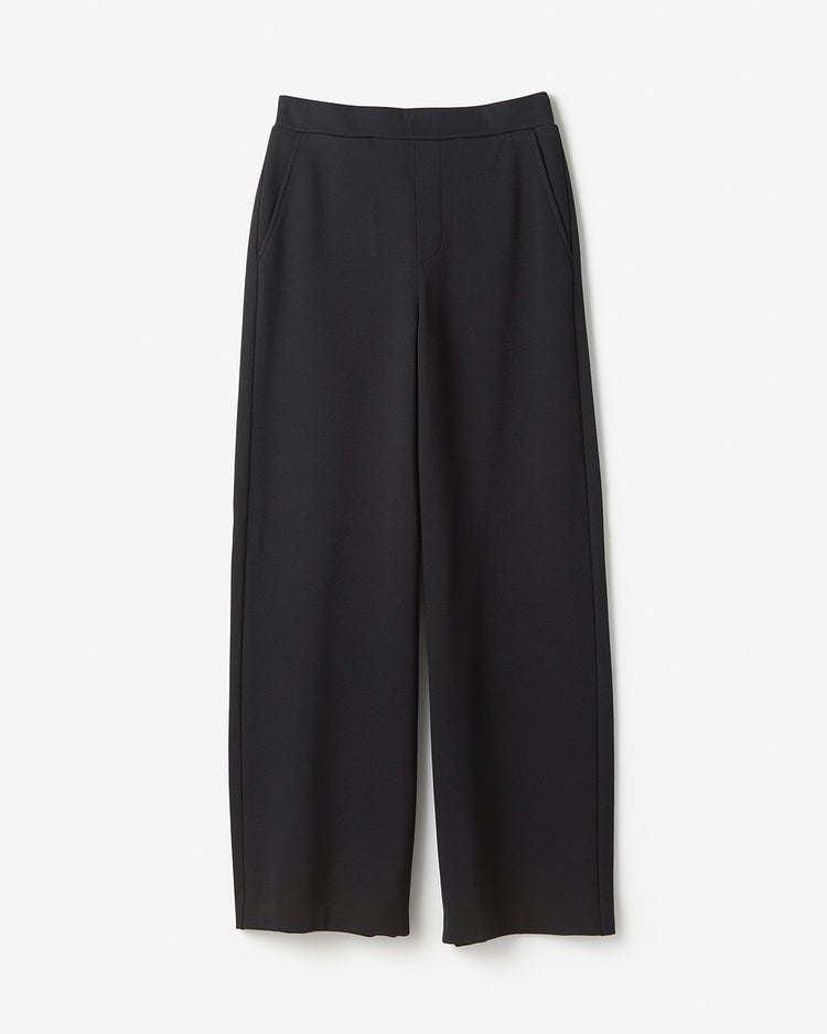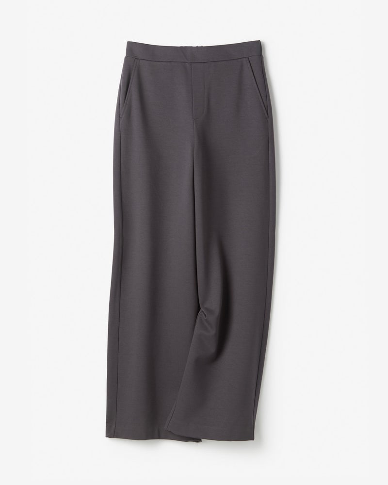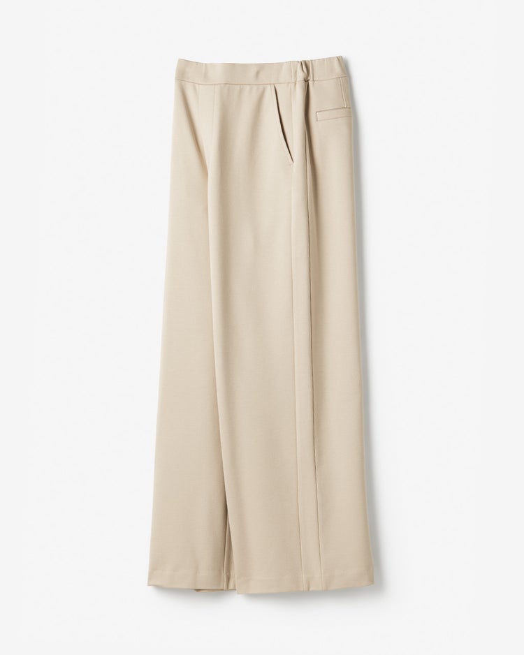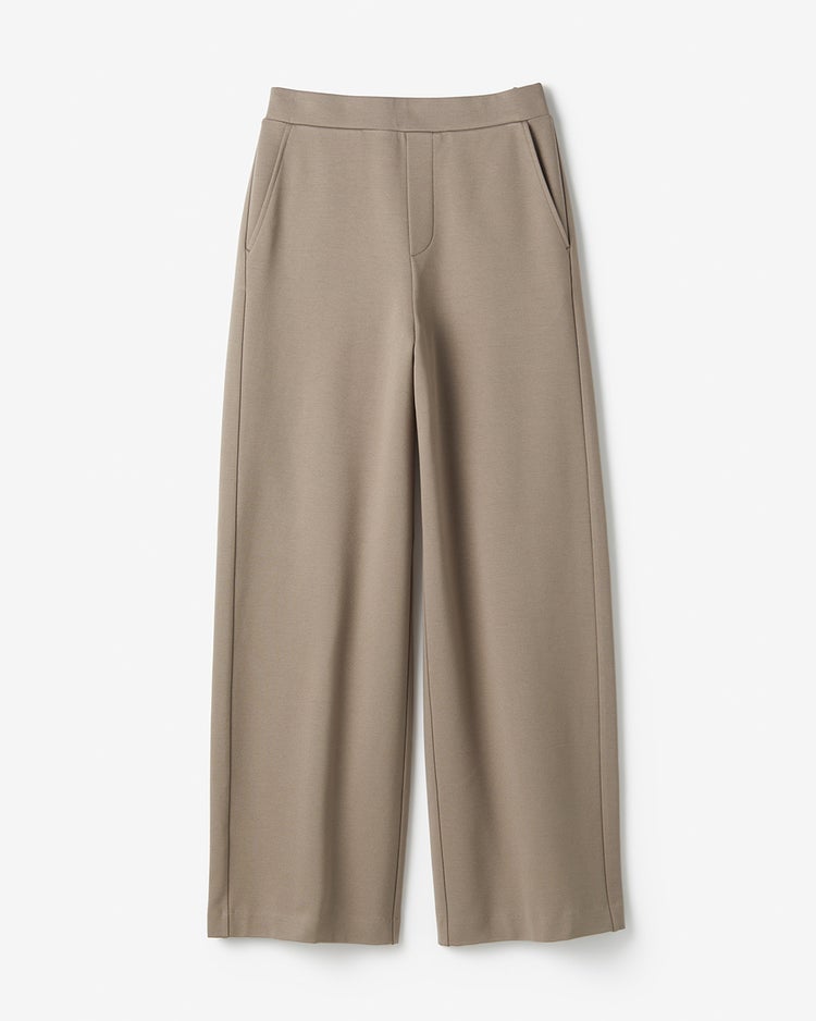 サイドライン入り洗練ワイドサイドに切り替えラインを入れて横ハリ感を抑え、横顔もスマートな印象に仕上げた控えめワイド。前がすっきりのウエスト総ゴムで、お尻を上向きに見せる飾りポケットやファスナー風開き見せデザインで全方位美しく。