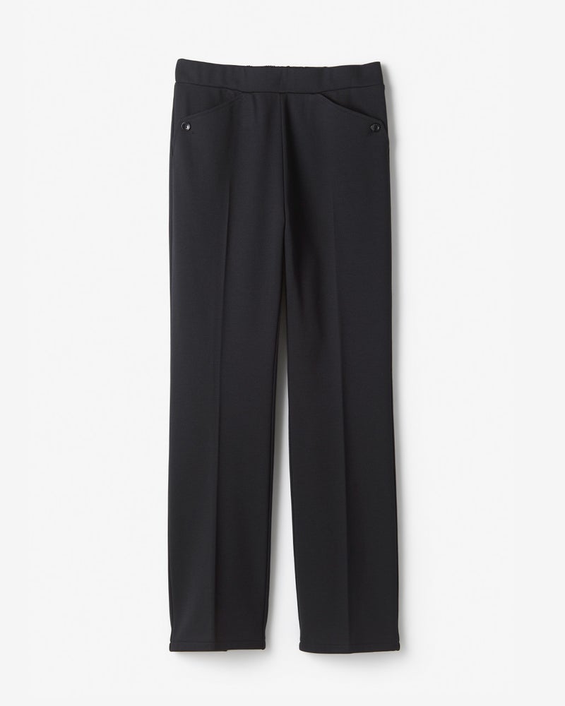 ボタンを飾った上品ブーツカット旬顔ブーツカットを大人に着こなしやすく。膝の位置を少し上に設定することで、膝下がすらりと伸びた脚長シルエットに仕上げました。後ろのみゴム寄せしたきれいめウエスト総ゴム仕様で、両サイドにポケット付き。両サイドのポケットにはボタンを飾り、アクセントを添えました。