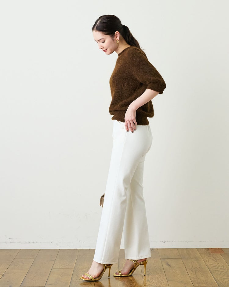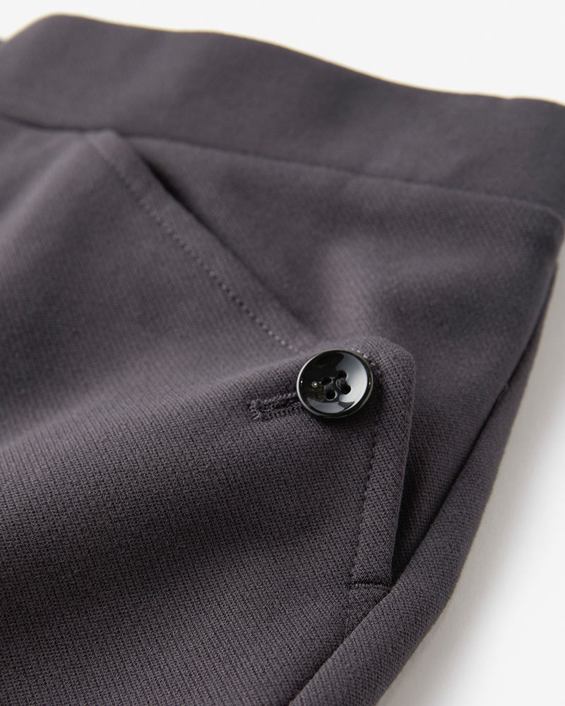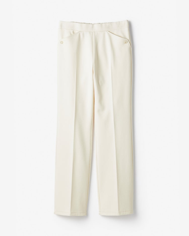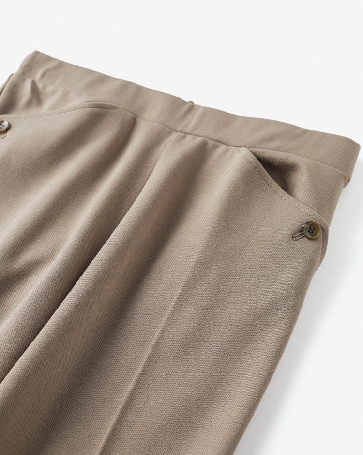 ボタンを飾った上品ブーツカット旬顔ブーツカットを大人に着こなしやすく。膝の位置を少し上に設定することで、膝下がすらりと伸びた脚長シルエットに仕上げました。後ろのみゴム寄せしたきれいめウエスト総ゴム仕様で、両サイドにポケット付き。両サイドのポケットにはボタンを飾り、アクセントを添えました。