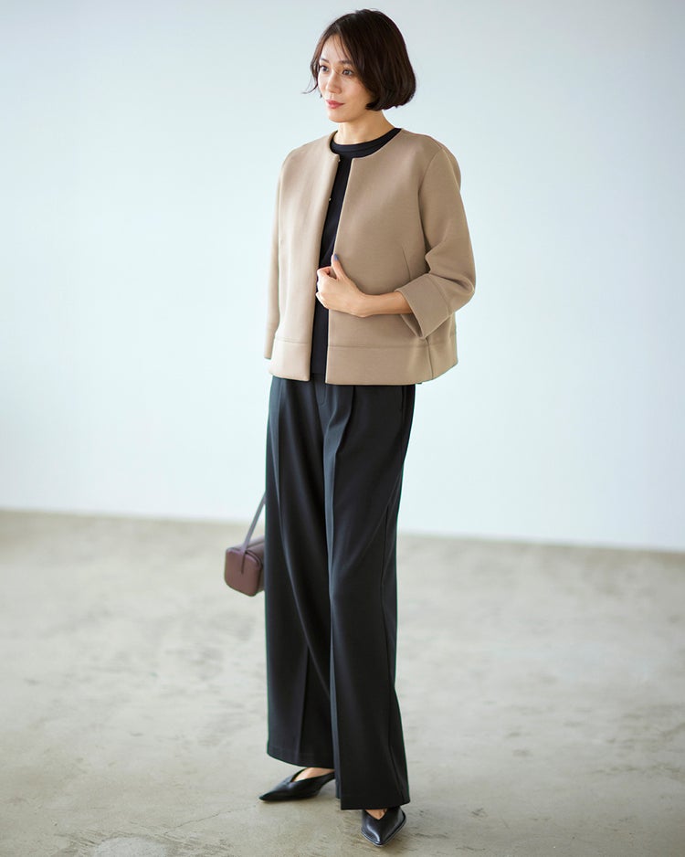 オフィスにもカジュアルにも似合う、センタープレス×ワンタックの旬顔ワイド。ウエストゴムの開き見せ仕様。両サイドとヒップ右にポケットあり。