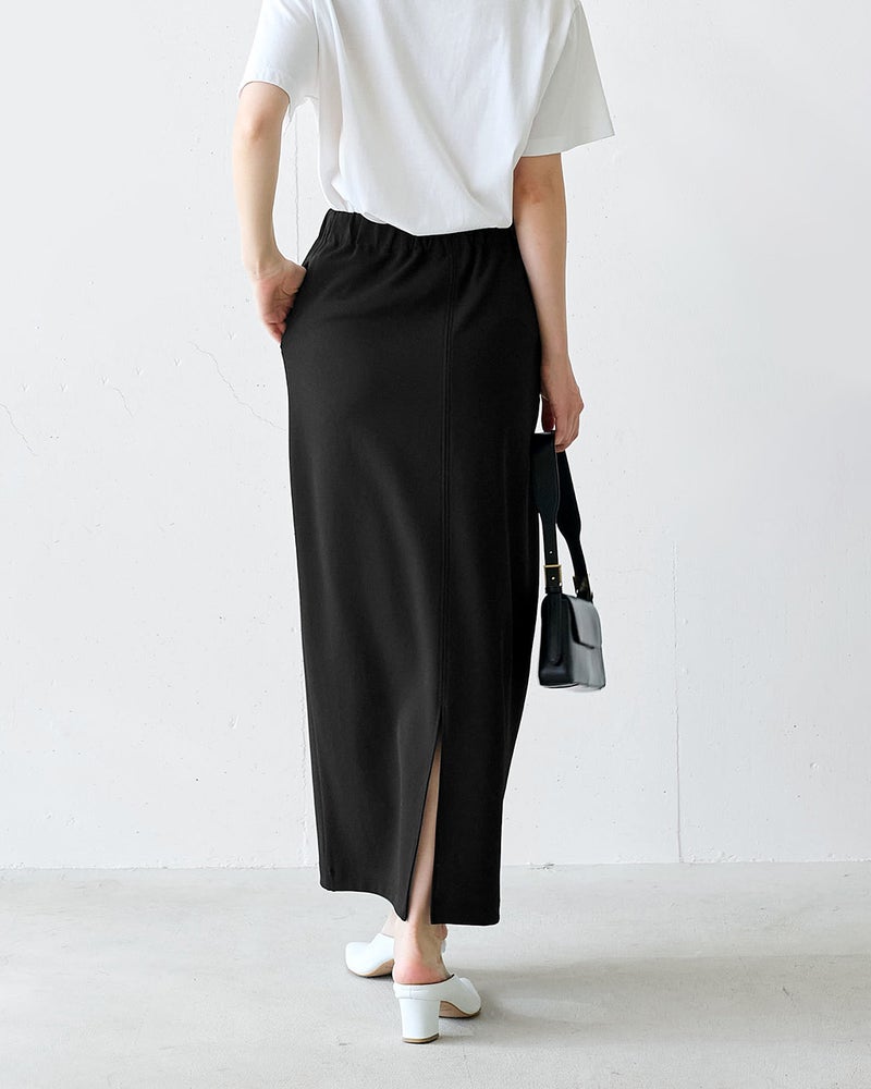 ゆったり着てほっそり見えるナロースカートは、どんなトップスにも似合う万能シンプルデザインです。
