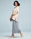 きちんとした感じですがストレッチが効いていてとても動きやすく身体のラインも拾いません。ウエストはゴム仕様、左右にポケットもついているので使い勝手もよく、バックスリット入りで足さばきも楽です。一枚あると色んなシチュエーションで活用できるのでおすすめです。