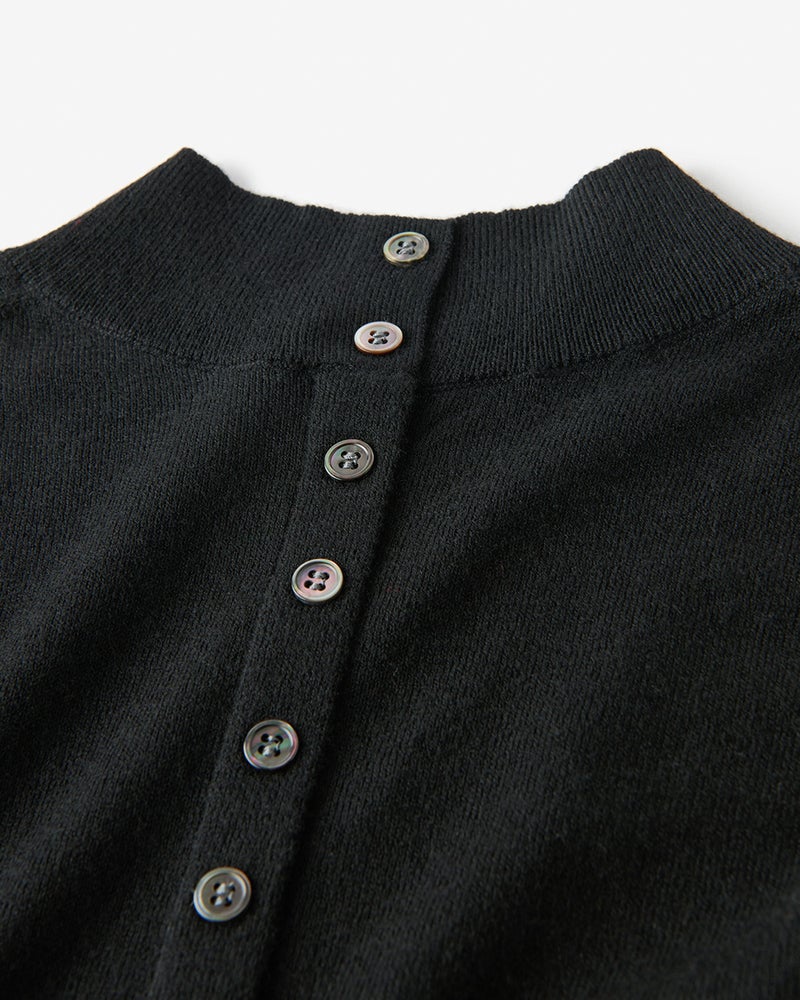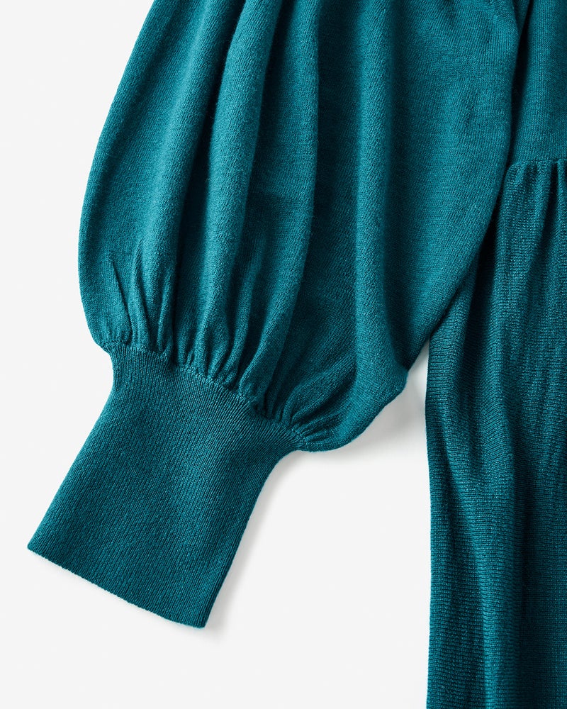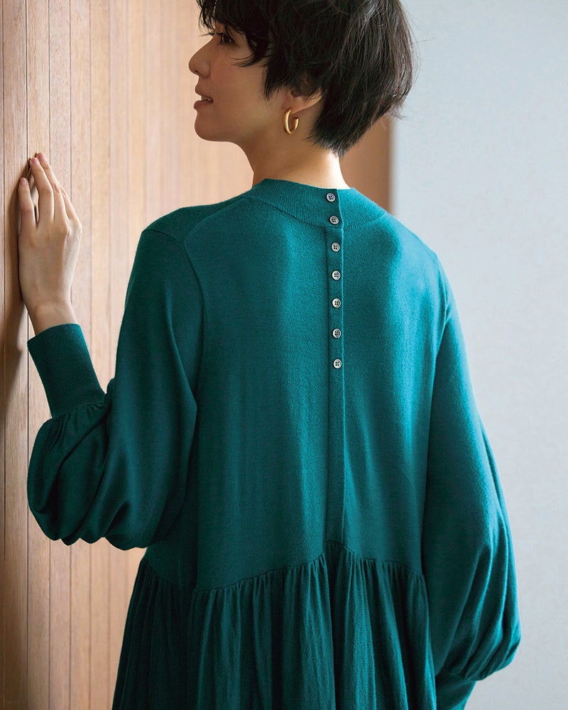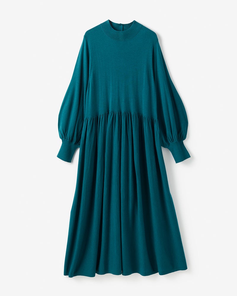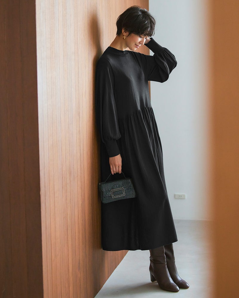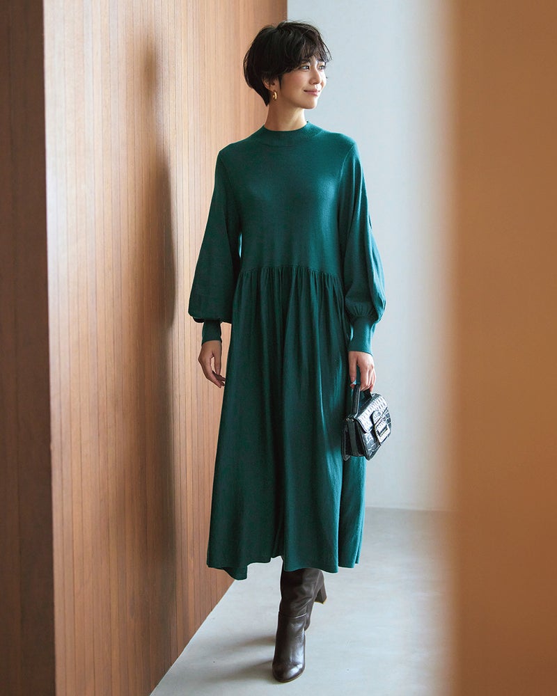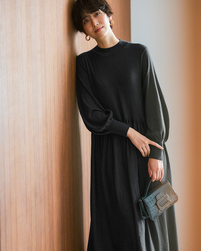 首に沿うハイネック、ふんわりボリュームのあるパフ袖で女らしく着こなせるニットドレス。ゆったりシルエットのノンストレスなデザインですが、ウエストギャザーの効果でメリハリのあるスタイルに。
