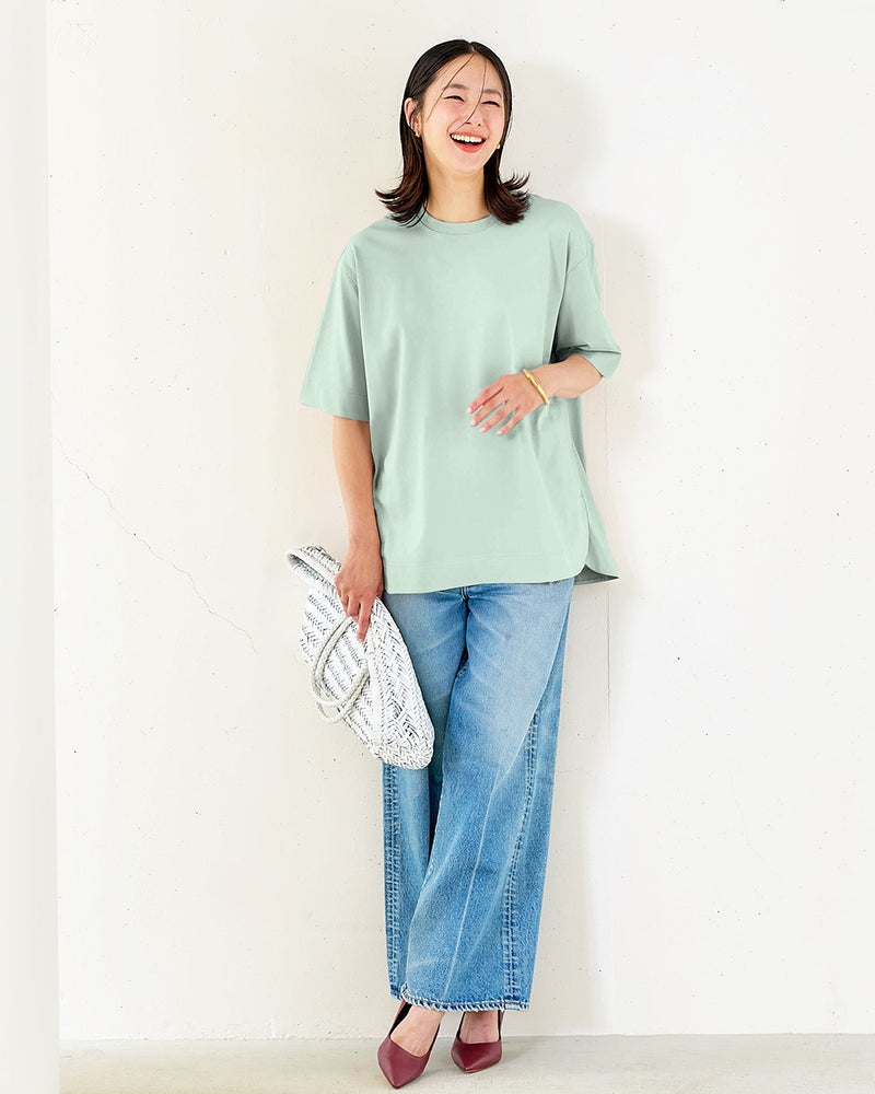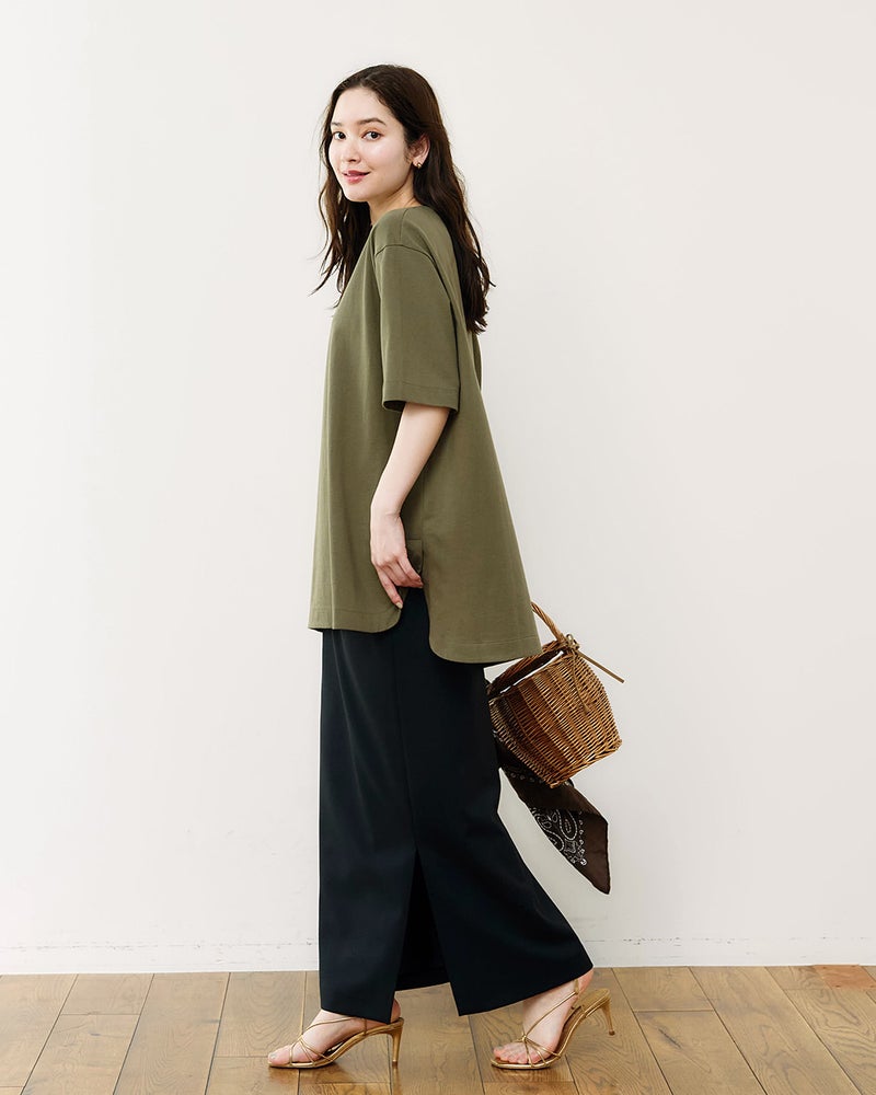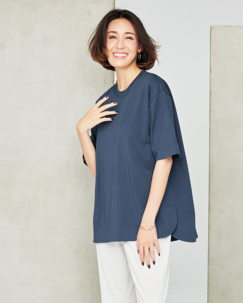下着が響きにくく&ひんやり心地よい真夏に嬉しい機能性と、大人が1枚でサマになるゆったりした華奢見せシルエットを両立した、新名品Tシャツシリーズが誕生。 二の腕やヒップなどボディのお悩みを全カバーしてくれるロングトップス。前後差をつけたラウンドヘムや、詰まり気味のすっきりした衿ラインでスマートな着こなしを叶えます。