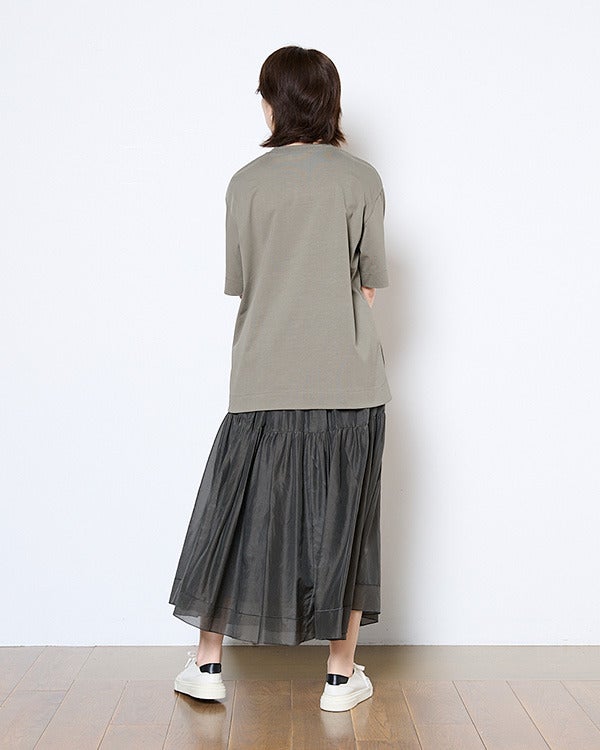 普段のサイズ:9号 着用サイズ:M - 着た感じひんやりして全くストレスなく着られます。肌触りもさらっとしていて暑い夏の日にはピッタリだと思います。シルエットも身体のラインを拾わない、それでいてブカブカのオーバーサイズでもない程良いサイズ感で大人にぴったりのTシャツだと思います。丈感も前後差がついているのですっきり見え、後ろはおしりがかくれる長さで安心して着られます。裾のラウンドもかわいいです。