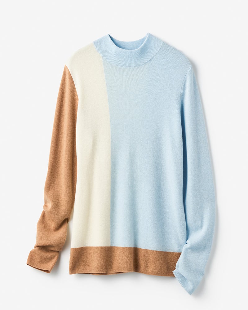 普段のサイズ:XL 着用サイズ:L - やさしい色合いのアイボリー、水色、ベージュの3色カラーのパネルデザインは見る角度で表情が変わり一枚着るだけで絵になるセーターです。ハイネックの首回りは伸びがよく苦しくないのにぴったりフィット、チクチク感は全くなし。薄手であたたかく思わずなでなでしたくなる肌触りはまさにマシュマロ!しあわせなふわふわ感です。通常XLサイズ、試着したLサイズはぴったりすぎでした。ボディラインを拾わずすっきりきれいに着るにはいつものXLサイズがよさそうです。