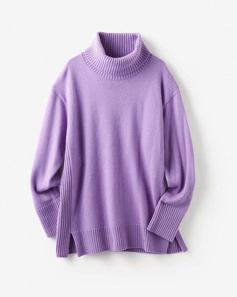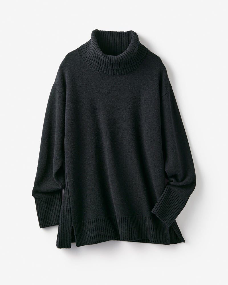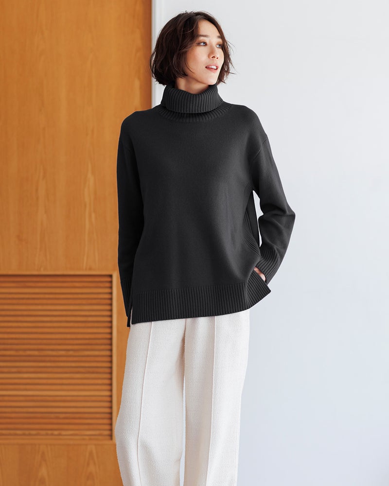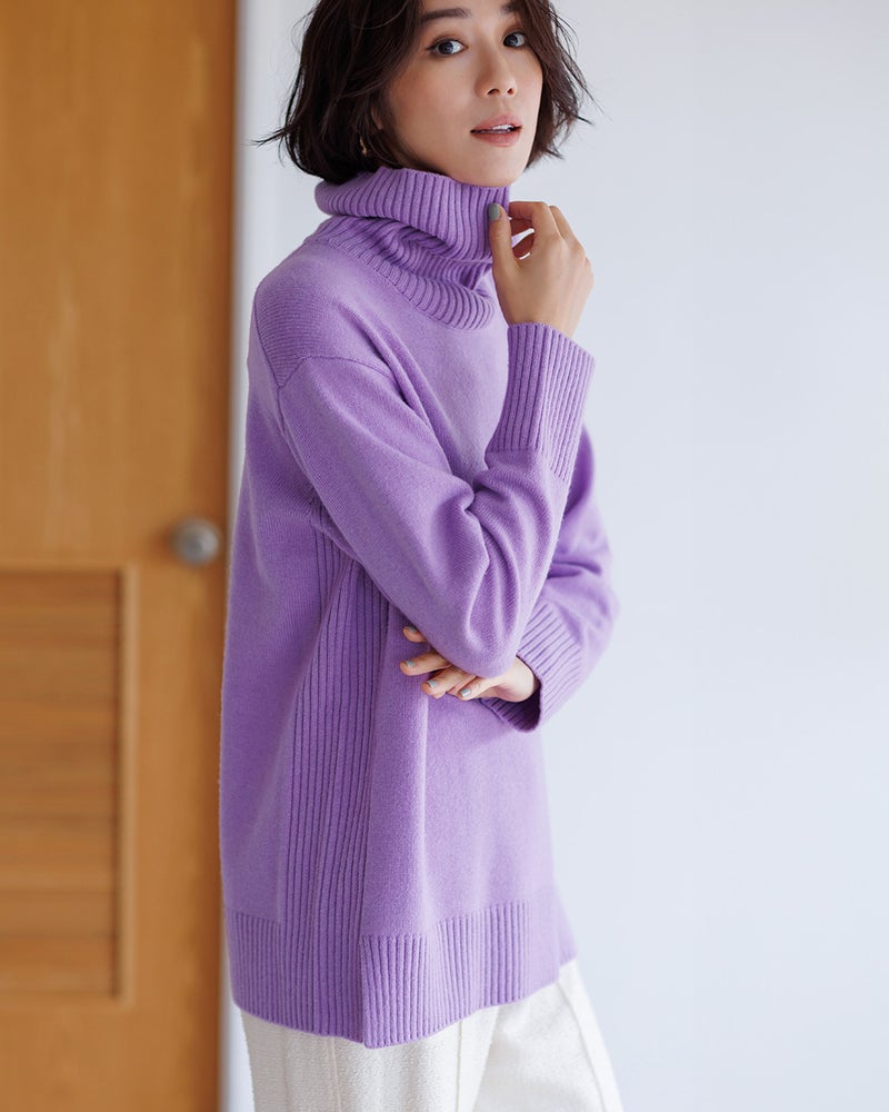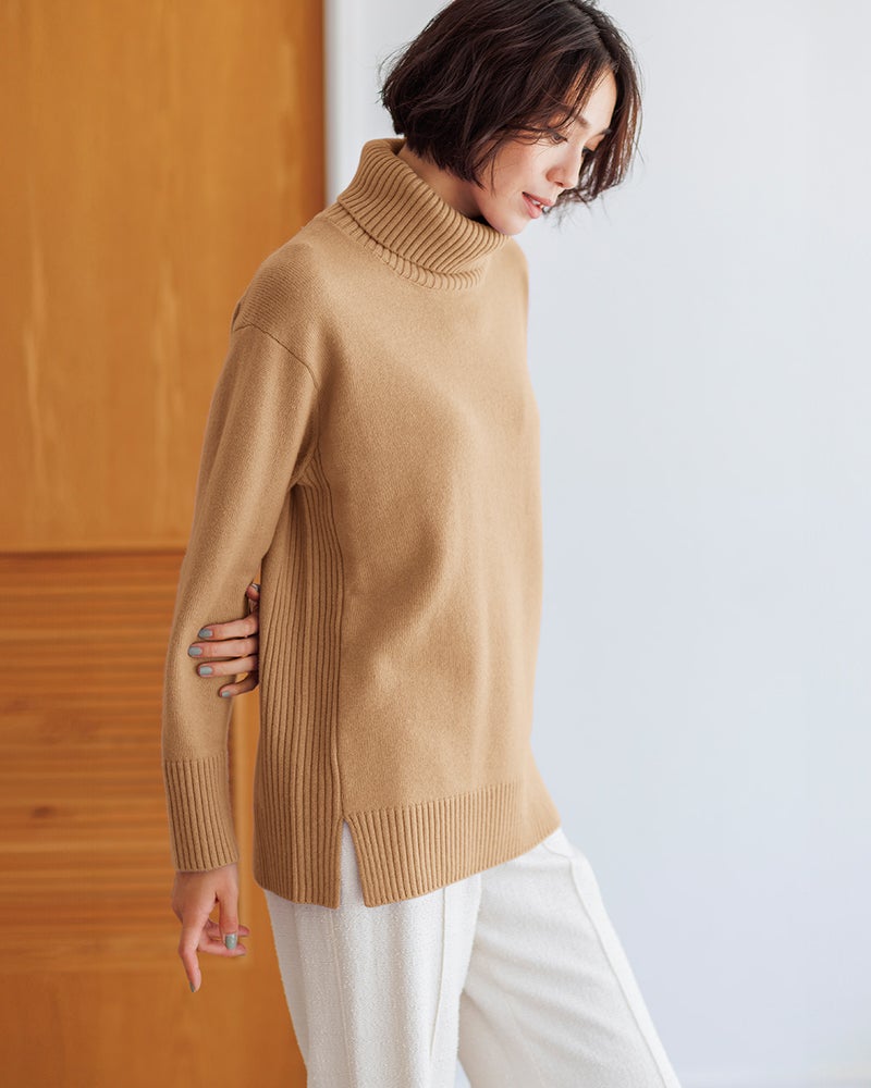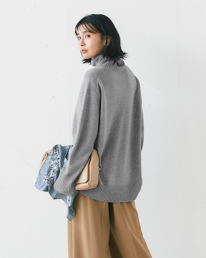 折り返してもタイトにならず、くしゅっとしてもキマるよう、編み方に工夫をしたオフタートルネック。