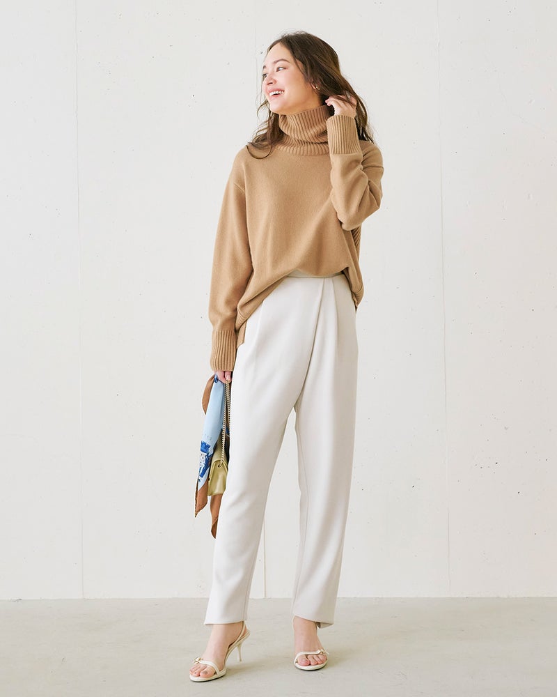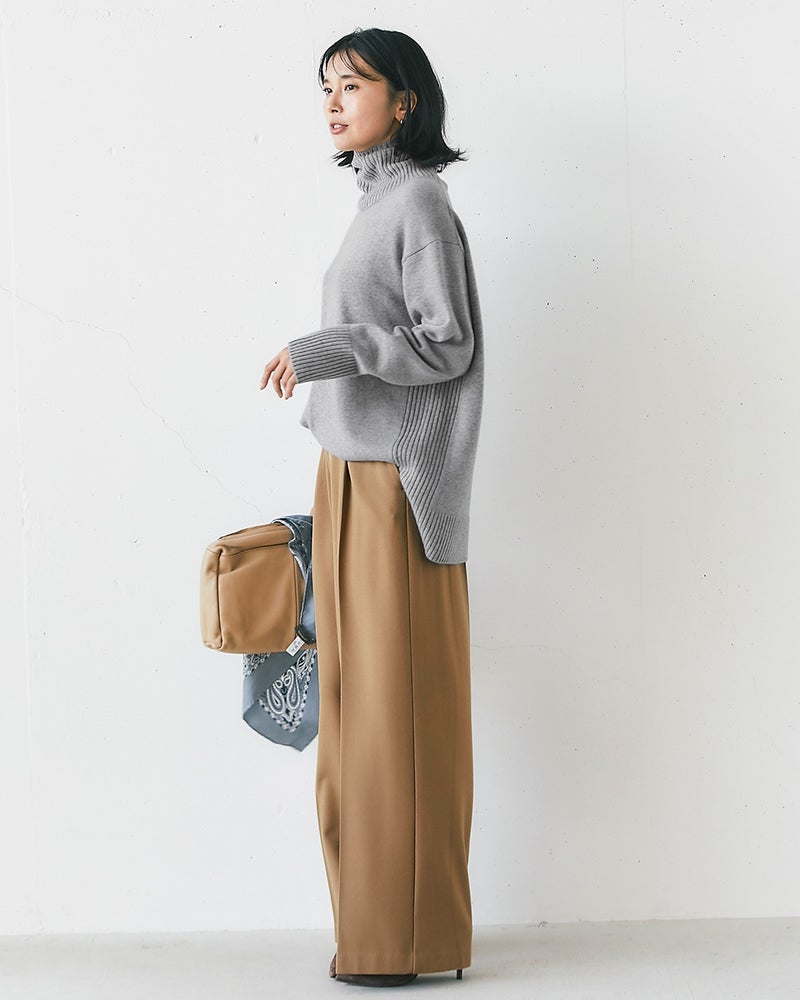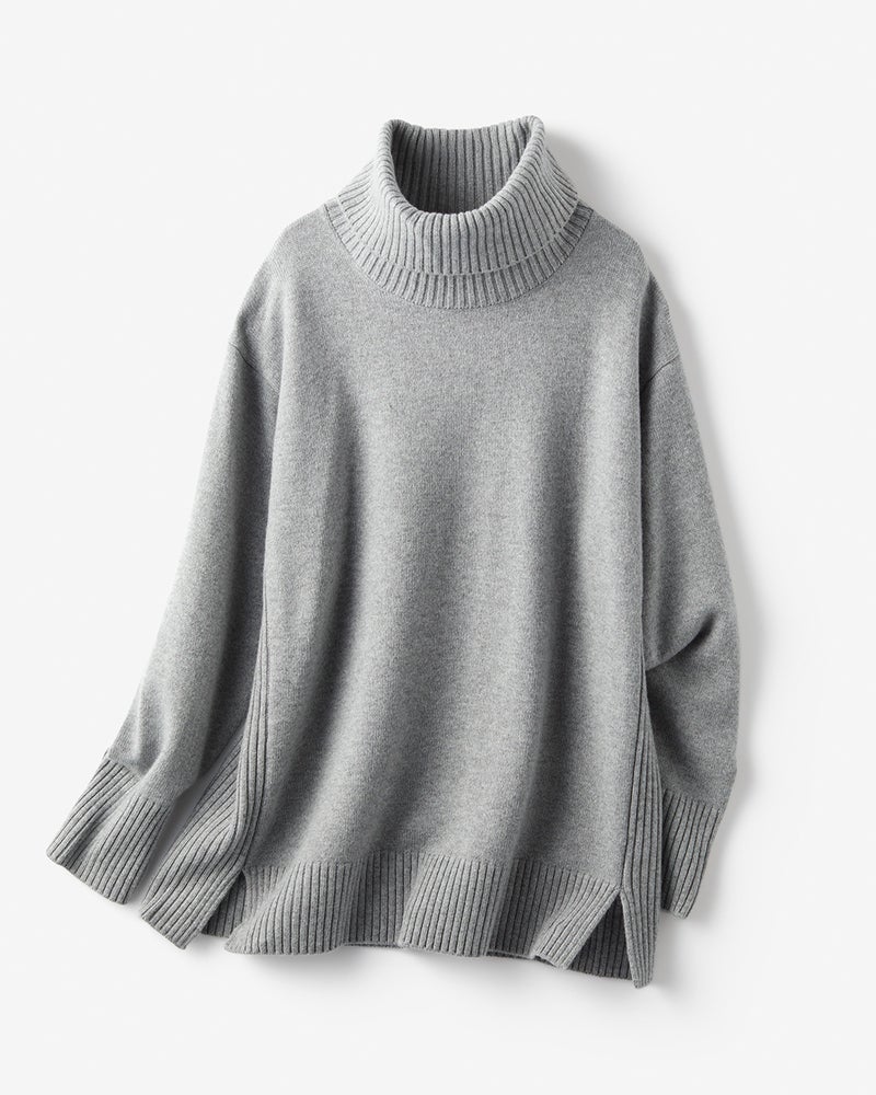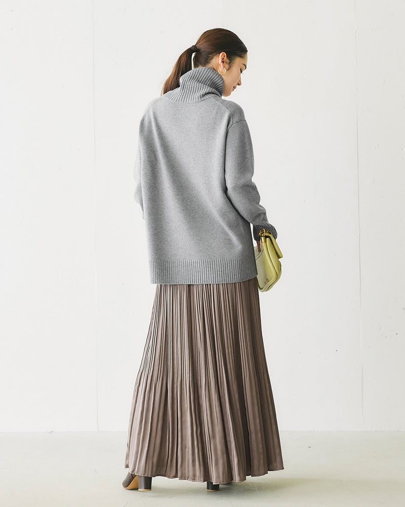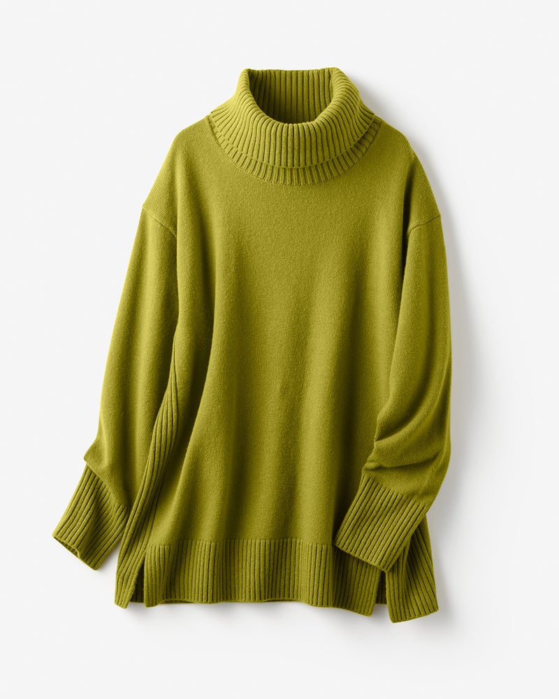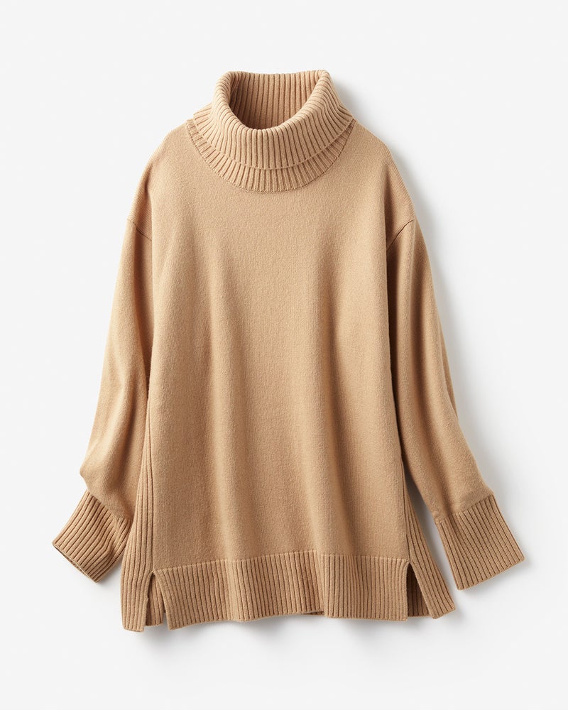 折り返してもタイトにならず、くしゅっとしてもキマるよう、編み方に工夫をしたオフタートルネック。